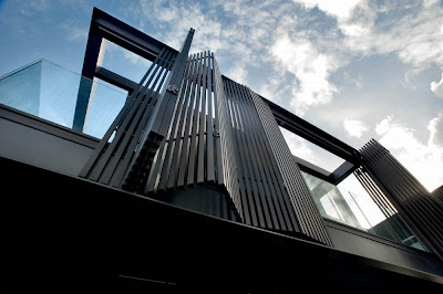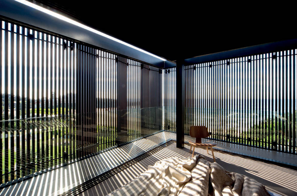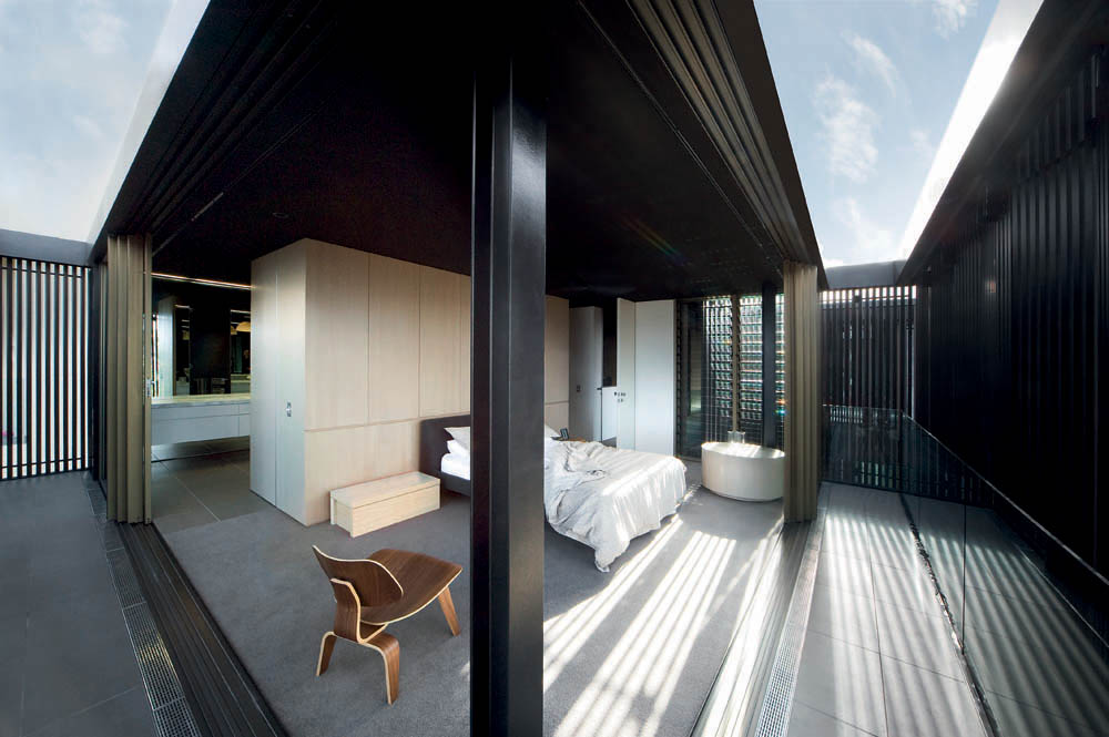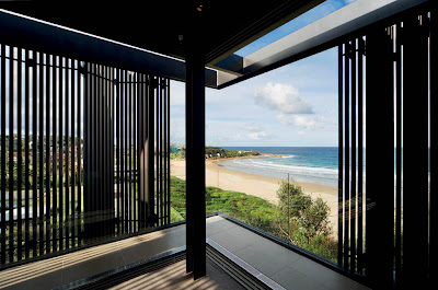 The Freshwater House developed the idea of the operable façade to mediate between the requirements for privacy and shading on a relatively public site adjacent to the beach. The resulting building is made up of three distinct parts; a podium base, a garden/ living space, and a bedroom volume clad with operable screens; each designed with unique spatial and material qualities. Continue for more after the jump: