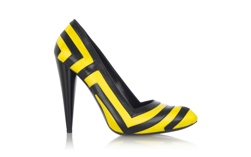 For years now we can’t get enough of stripes, which are coming on and off the runway in numerous shapes and forms. Here are black/yellow patterned Geometric Leather Pumps from Alexander McQueen’s Spring collection, with 12,5cm heel and 2cm platform. View more after the jump: