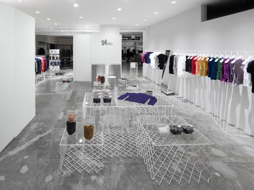 Since the products themselves are so brightly coloured, we used no colour whatsoever for the shop itself. All of the fixtures, including hangers and shelving, are 7mm steel, striped like a shopping basket. The entire shop functions as a display, and the white lines of the steel fixtures give the brightly coloured products a sense of volume. The idea is that as the items change, the shop itself will change character dramatically.