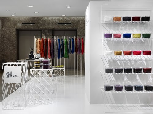 A new concept shop that offers a brightly coloured selection of items chosen from each of the Issey Miyake lines, alongside new, original items specially created for the shop. Each reasonably-priced item comes in 20 different colours, and the shop's lineup is renewed every two months. The overall concept derived from the Japanese convenience store, with its constant state of dynamic, fluid change. More info and images after the jump:
