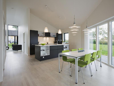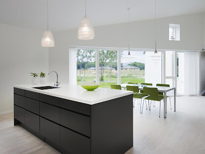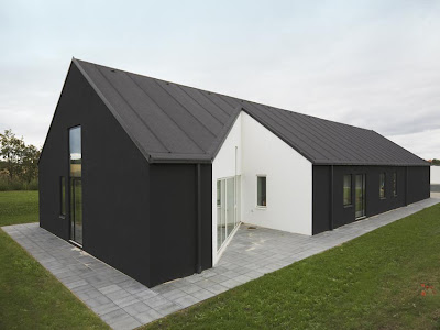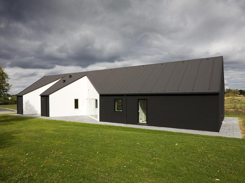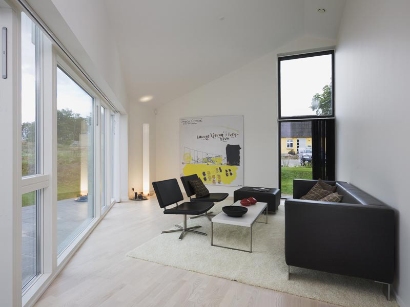 This house is built on 1735 square feet area of clean grass. Beautiful Denmark meadow surrounds the house from all sides making it contemporary urban dot in the middle of nature. The whole house looks like a cut object because of smart using of exterior colors. For more info and images continue after the jump: