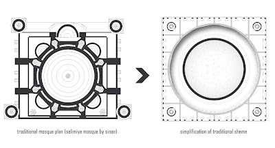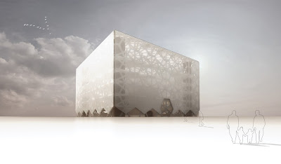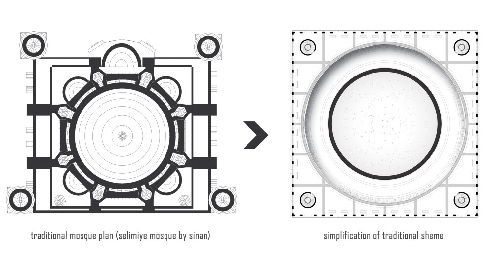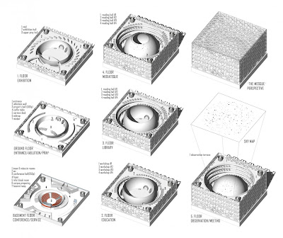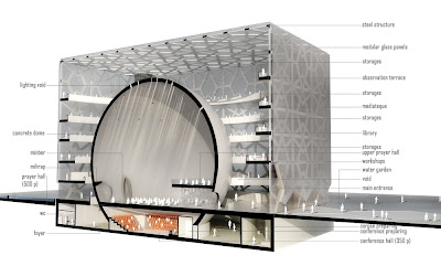 The mosque creates a shell with a steel constructed pattern, based on the concept points to infinity/divinity. A holy place to pray is nestled inside the large concrete sphere and the dome is actually large enough to gather the urban society together. Continue for more after the jump: