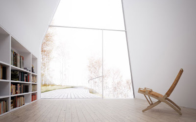 The relationship between the need for exposed storage and the interior liner of the house is a reciprocal one. Ostensibly problematic head-height limitations posed by the angled ceiling/wall planes are resolved by allowing the interior surface of the ceiling/wall to deviate from the roof surface as it nears the floor plane to become plumb. The thickness created between the outer roof surface and the inner wall surface is then reclaimed as poche from which to carve, creating bookshelves and showcases. Perceptually, the ambition is to tuck the pieces on display within the implied surface of the interior liner, enabling the items to be seen, while providing the possible conception of the space as a simple volume.