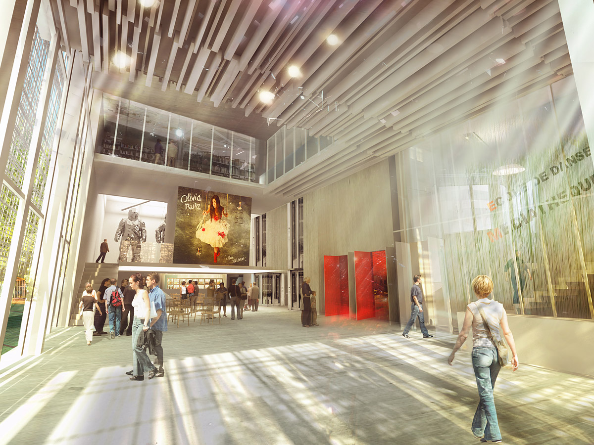 The main entrance of the building is served by a public square. It establishes a strong link between the building and the city and naturally leads the public to the lobby. Therefore, located on the ground floor, the spacious glazed hall is like an extension of the court allowing a smooth flow of circulations. A “summer open position” creates a large lobby open to the outside, blurring even more the limits between interior and exterior. – from OFF Architecture