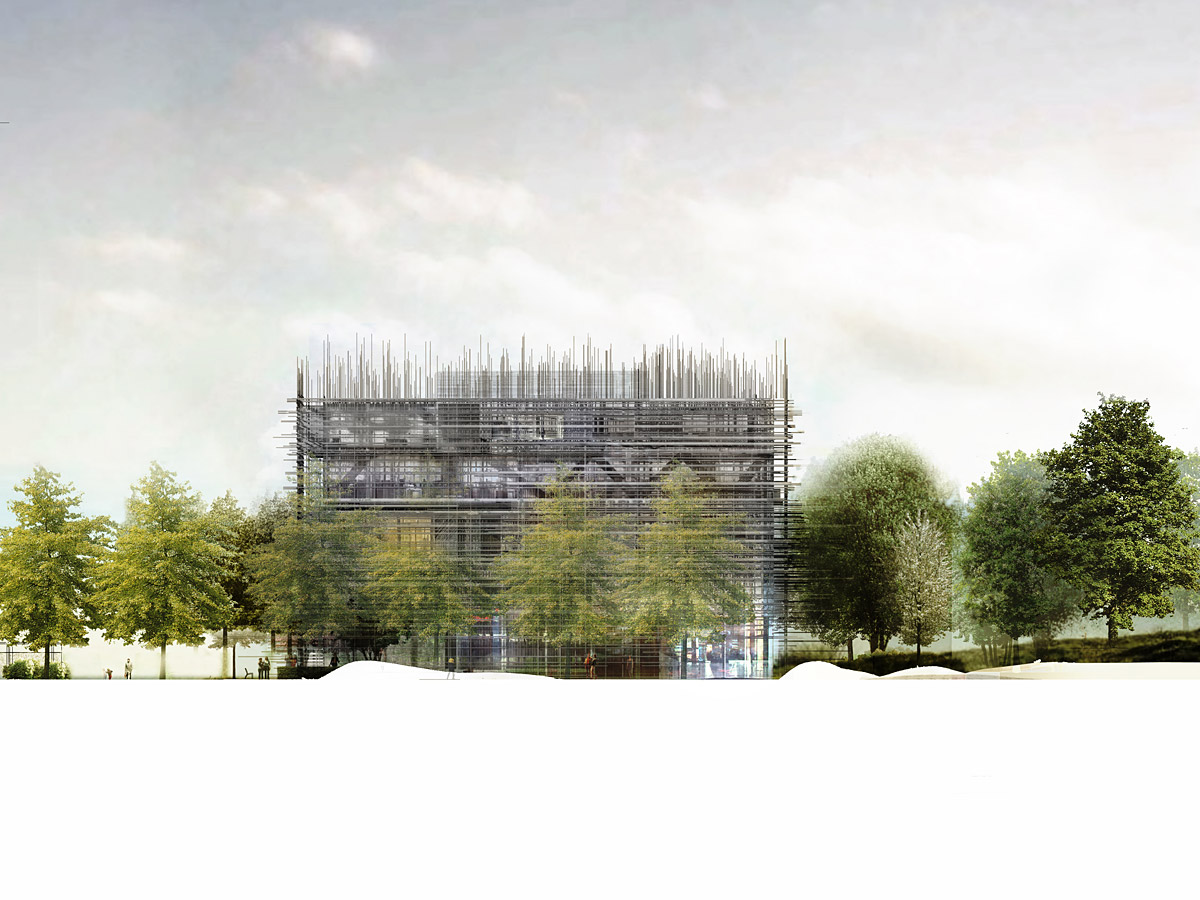 It had to be a symbolic regional place for cultural exchanges and initiate an urban renewal for the city. But at the same time, the project should not break the scale of the neighborhood – mainly consisting of a low density suburban fabric entangled in a dense vegetation. We developed a high and compact building (36mx36mx18m) that can be seen from all over the city. Indeed, it can be seen, located, identified from far and interacts with the old city church’s bell.