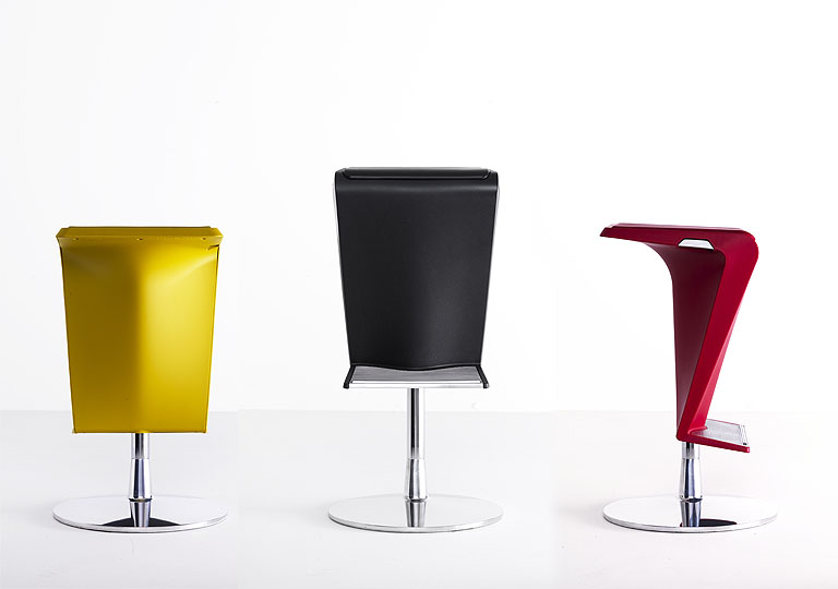Dynamic and original, the Dart stool makes any space more comfortable and elegant: the living room, the kitchen, or contract furnishing schemes. With a strong polypropylene structure and a comfortable soft polyurethane seat, it is available in black, red, white or curry yellow. Its steel frame is equipped with gas pistons. The circular base, ergonomic footrest and button for adjusting its height are in polished pressure die-cast aluminium. Continue for more after the jump: