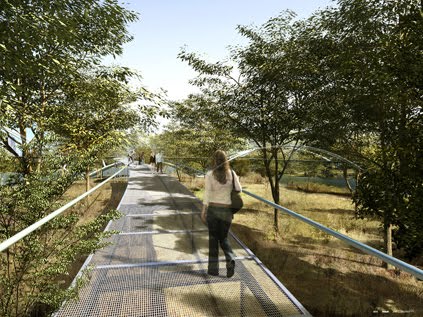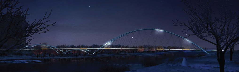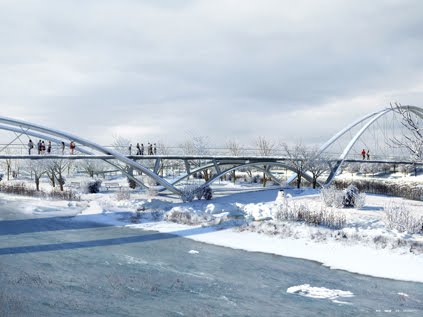 The design of the St. Patrick's Bridge will take its cues both from the urban and from the natural. The Bow River is a ribbon of nature winding through the urban environment of the city. For pedestrians and cyclists crossing the river, the footbridge becomes an instrument through which to observe, understand, and appreciate the spectacle of the river. View more after the jump: