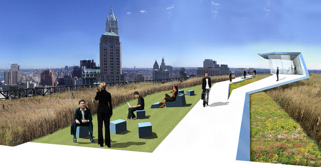 First, it directs visitors to a sales office hung with images rendered by JSA depicting the office build-out, as well as a “green” roof terrace, designed in collaboration with Balmori Associates. Turf and sedum planted around the periphery of the space enable visitors to imagine this future outdoor amenity. Shifting from wall to ceiling, the blue line finally brings visitors to a 3,000 square foot office prototype consisting of three areas – reception, open office, and conference – all designed to take advantage of the building’s panoramic views of the New York skyline. – from Joel Sanders Architects