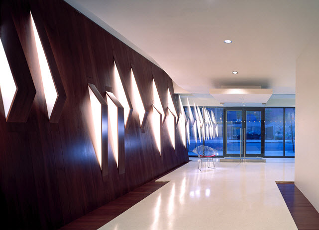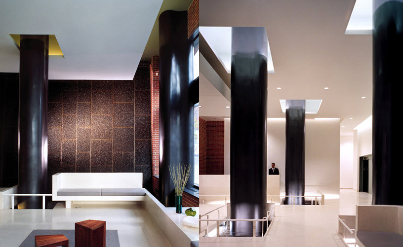 In the larger lobby, an inner shell constructed from smooth, synthetic materials (painted sheetrock, terrazzo, hot rolled steel) appears to float within the building’s brick enclosure, lined with textured surfaces associated with nature (green-tinted concrete encrusted with water washed pebbles). Structural columns encased in fiberglass pierce backlit cutouts in the floor and ceiling, dematerializing boundaries. Inset felt floor panels and Ultrasuede upholstery offer a softer counterpoint to the polished terrazzo. The smaller lobby features a white terrazzo floor that folds vertically to create a dramatic backlit canted wall visible from the street. Designed to capture the attention of pedestrians, this receding walnut plane visually connects city street, vestibule and elevator lobby within. – from Joel Sanders Architect