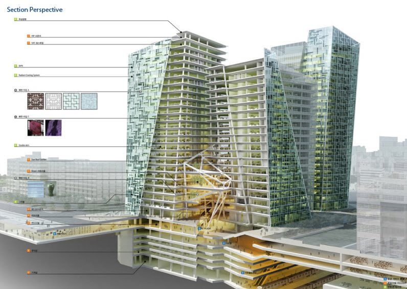 The design reflects the vision of KT as a landmark tower and the generous spirit of the KT employees, Customers, and Visitors who serve this place. From the exterior, the form clearly emphasizes symbolism of KT by introducing elements for art, culture, nature, environment, and technology. The recognition of the towers and it’s facade creates a unique transition between the US Embassy and Kyobo with a dynamic gesture of multiple towers. Continue for more after the jump: