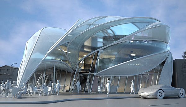 The project is characterized by its response to the urban setting, its vision for a unique office work environment within a highly sustainable building design, and by its formal and structural elegance. The three level mixed use building includes a café and retail space at the ground floor and two levels of open office spaces above. The office spaces are configured around a center atrium space that opens up to the street creating the main entrance for the building. The ephemeral quality of the building envelope is realized through a high tech fabric enclosure system that utilizes multiple layers of fabrics with different degrees of transparencies/ opacities. This envelope is able to adjust to the different exterior light conditions and provide consistent natural daylight levels throughout the office spaces. While the more delicate fabric encloses for the upper two office levels, the restaurant and retail spaces on the ground floor open up to the street with a glass envelope. Landscape elements create a green barrier between the outdoor seating area of the café and the street.