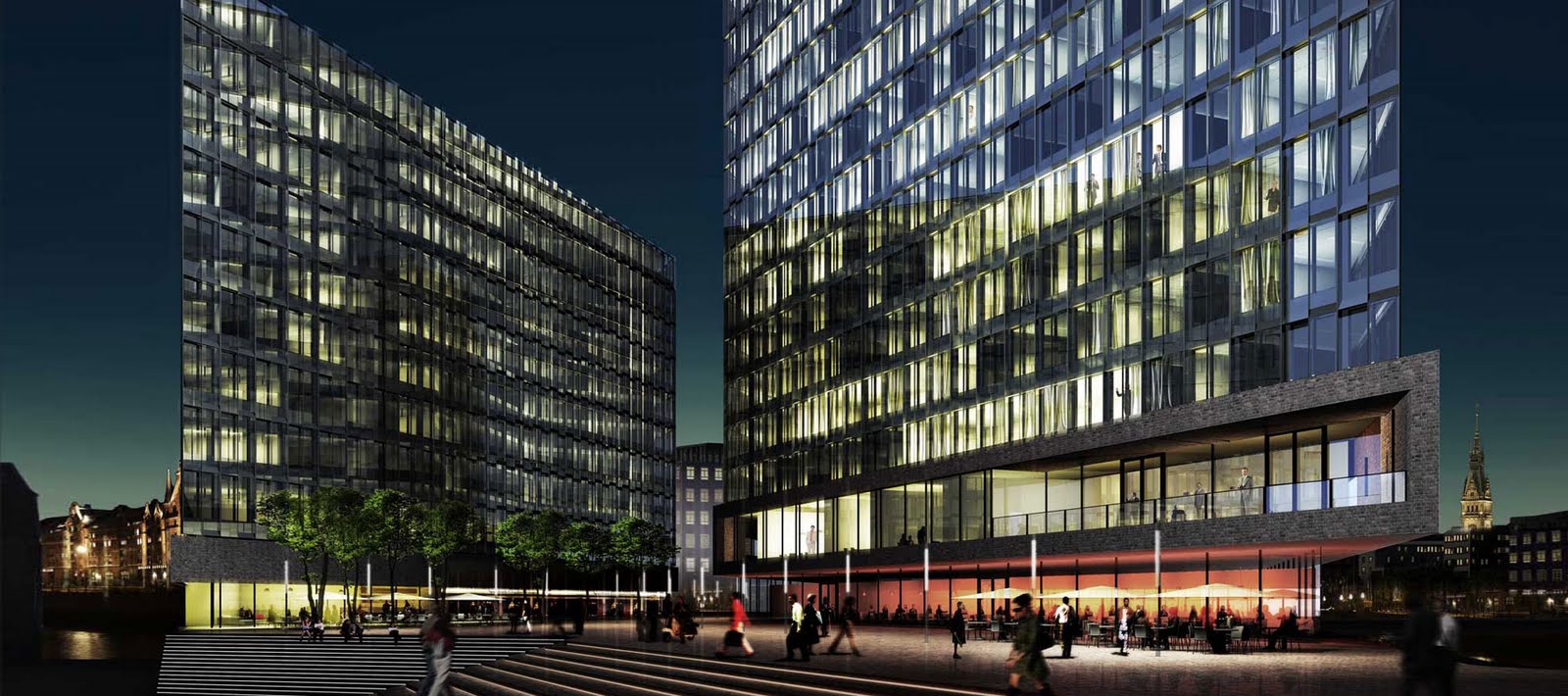 The two buildings form two plazas: an arrival plaza for pedestrians, cy-clists and drivers towards Brooktorkai and an open public plaza, which has a direct connection to the waterfront promenade.
