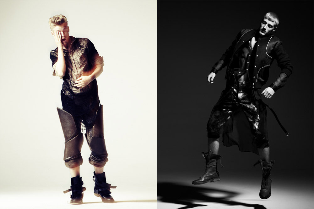 Left : Model Alex Jahansson in Alexander Macqueen Chain linked jacket, Phillip Lim trousers,white Prada Button down shirt ,Black strapped jacket by Jeremy Scott for Addidas shoes by Comme des Garcon shoes . Posing with model Jozef Exner in Lanvin rain coat over Gareth Pugh ribbed leather coat,Acne charcoal denim patched pants , sheer tank by Fingers Crossed .Shoes by Martin Margiela. Far Left :Model Dennis in Coat by Phillip Lim sheerling patched coat.T- back tank by Obesity and speed. black dress trousers by Louis Vuitton ( if brown by Denis Colomb)