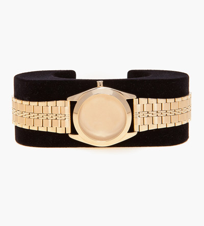 The always innovative Maison Martin Margiela following the theme of their collection designs the Watch Bracelet, but this perhaps the most interesting accessory piece in their line can not really tell time it is just a bracelet. The gold toned watch bracelet is inseparable from the black case.