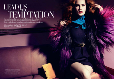 High fashion beauty Alla Kostramichova poses for Anthony Maule's British Harper's Bazaar shoot captured for the pages of September 2011 edition. Vanessa Coyle outfits Alla in jewel coloured pieces from the likes of Tom Ford, Valentino, Emporio Armani, Gucci and Maison Martin Margiela to name a few.