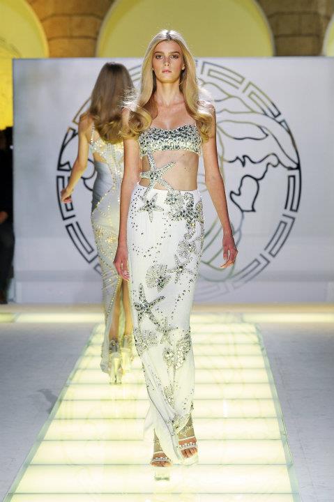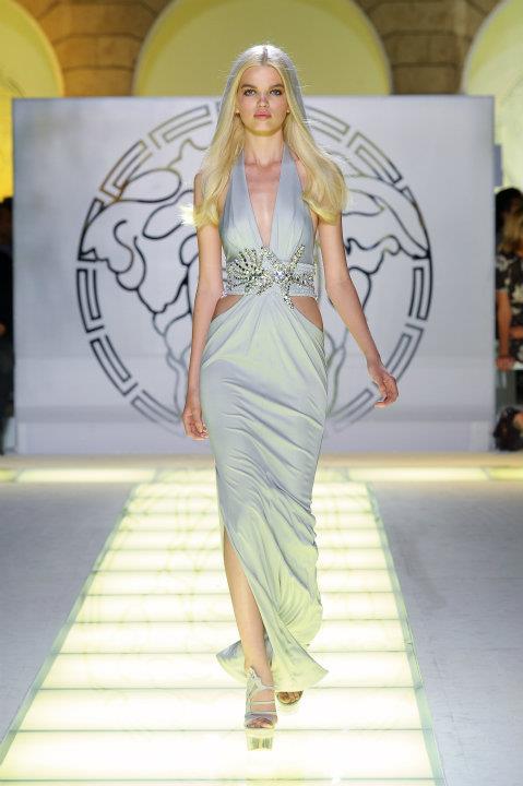 For the Spring Summer 2012 Versace collection Donatella brings her definition of modern glamour to a new high, a look into her fashion house's archive brings out a new strong vision. The two sides of the collection go from the mysterious dark to the dominant virgin light, on the one side Versace has pastel colours and sentiments of the sea with a touch of sparkle on the other black leather, golden studs and the daring mini deliver the rock edge. For the finale the designer dashed with a selection of striking gowns.