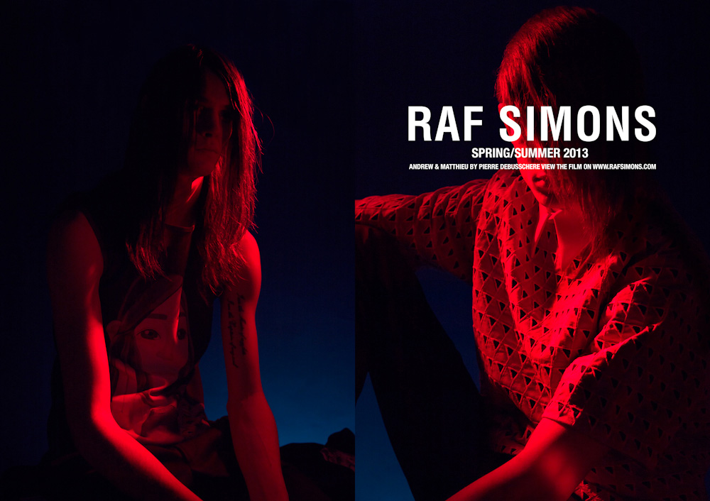 For the eponymous label of designer Raf Simons, photographer Pierre Debusschere delivers these exceptional SS13 images starring Andrew Westermann And Matthieu Gregoire. Do not miss the video above!