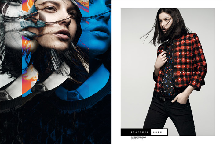 Sportmax Code Fall Winter 2013 campaign shot elegantly by Gregory Harris with model Tatiana Cotliar styled by Veronique Didry (Trouble Management). Fall Winter ads feature creative direction Macs Iotti, hair styling by Tamara Mcnaughton and makeup by Karan Franjola.
