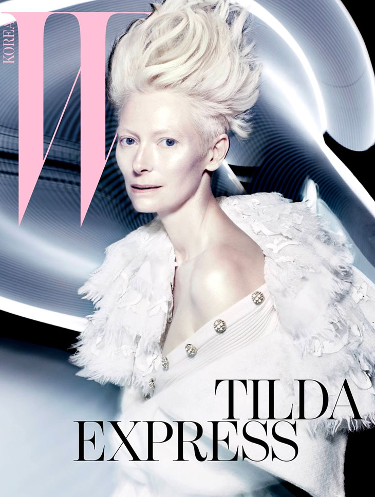 Tilda Swinton continues her mesmerizing love affair with the fashion scene by landing the latest cover of W Korea. The eye catching cover is work of fashion photographer Sølve Sundsbø, fashion editor Jacob K. Makeup is work of Petros Petrohilos, hair styling by Syd Hayes.