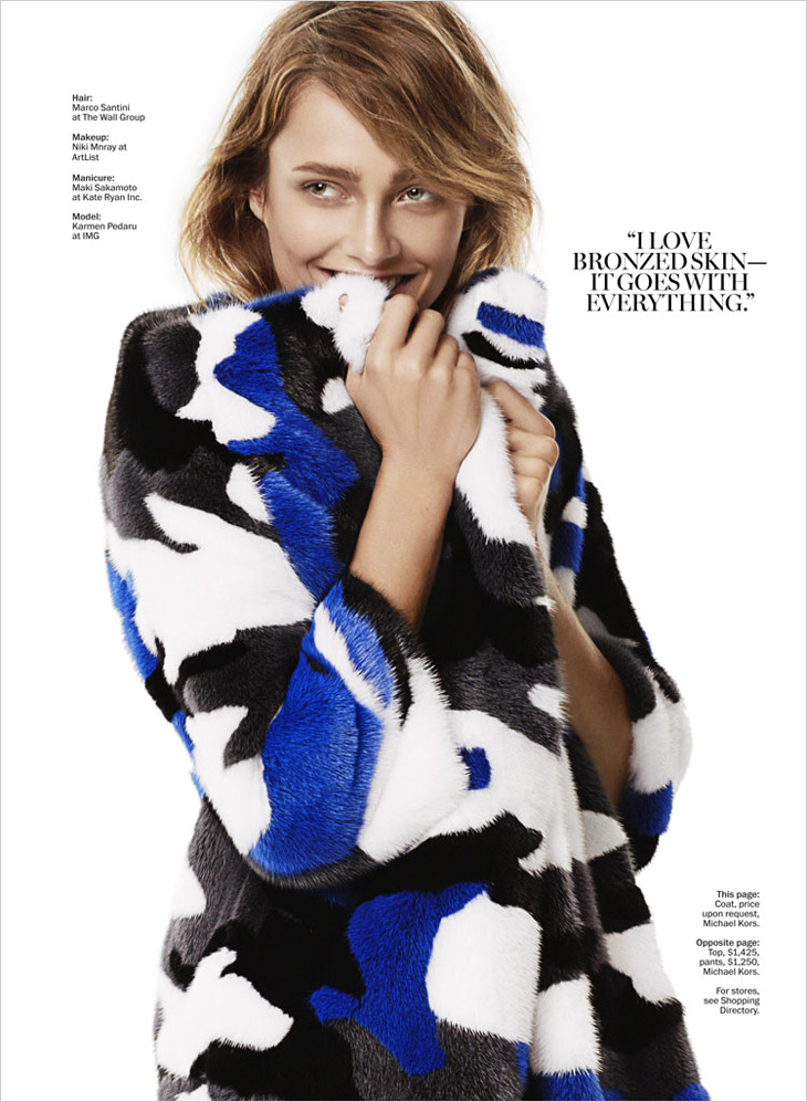 The always gorgeous Karmen Pedaru captured by fashion photographer David Roemer (Atelier Management) for the latest edition of Marie Claire. Estonian top model is styled in Michael Kors pieces by Laura Ferrara.