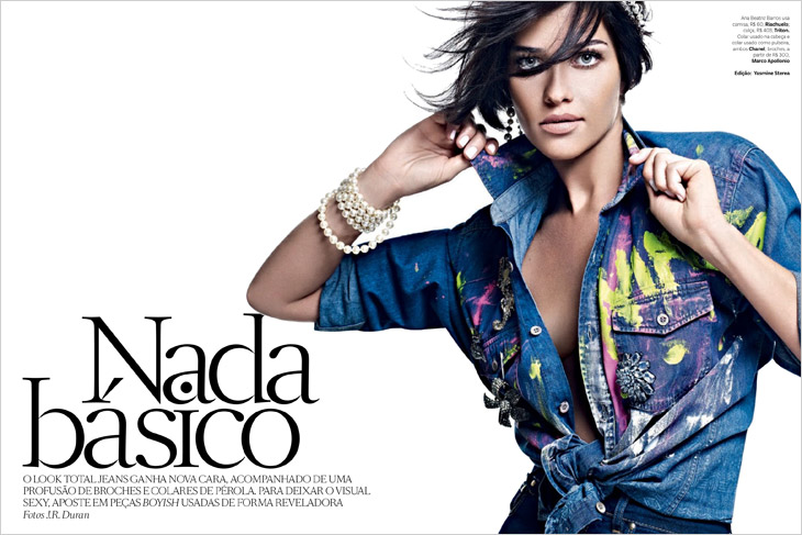 Top model Ana Beatriz Barros in a denim shoot by J.R. Duran prepared with styling from Yasmine Starea for Vogue Brazil's October 2013 edition. Hair styling and makeup courtesy of Max Weber.