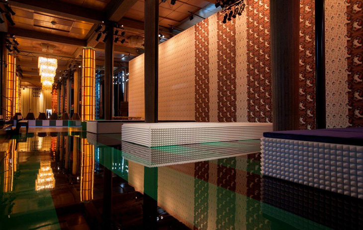 Miuccia Prada and Miu Miu team up once again with AMO, this time working on the showstopping design of the spring summer 2014 showspace at Palais d’Iena in Paris. Created under the “Joyful Occupation” theme the space allowed the models to move through the seemingly discontinuous interior landscape in a sequence of tridimensional collages. While the audience occupied a variety of seating areas each owning a unique design identity. Catwalk design allowed a multitude of view points, providing a different experience to every guest.
