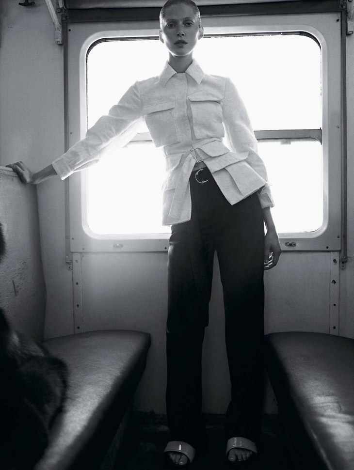 Iselin's classic and empowering hairdo is work of hair stylist Damien Boissinot while her natural looking makeup is courtesy of makeup artist Christelle Cocquet. Train location beautifully goes hand in hand with magazine's November 2013 Travel edition.
