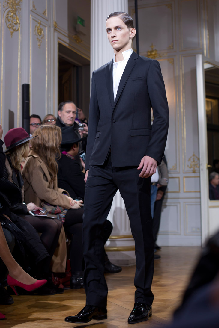 Icosphere took the runway of Paris Fashion Week to present its fall winter 2014 menswear collection. The designs reminiscent of iconic menswear pieces brought a breeze of longed after elegance to the spotlight. The colour breaks from the classic palette with a splash of lipstick red. The pieces undoubtedly hold a strong evening-wear sentiment shaped in a formal manner.
