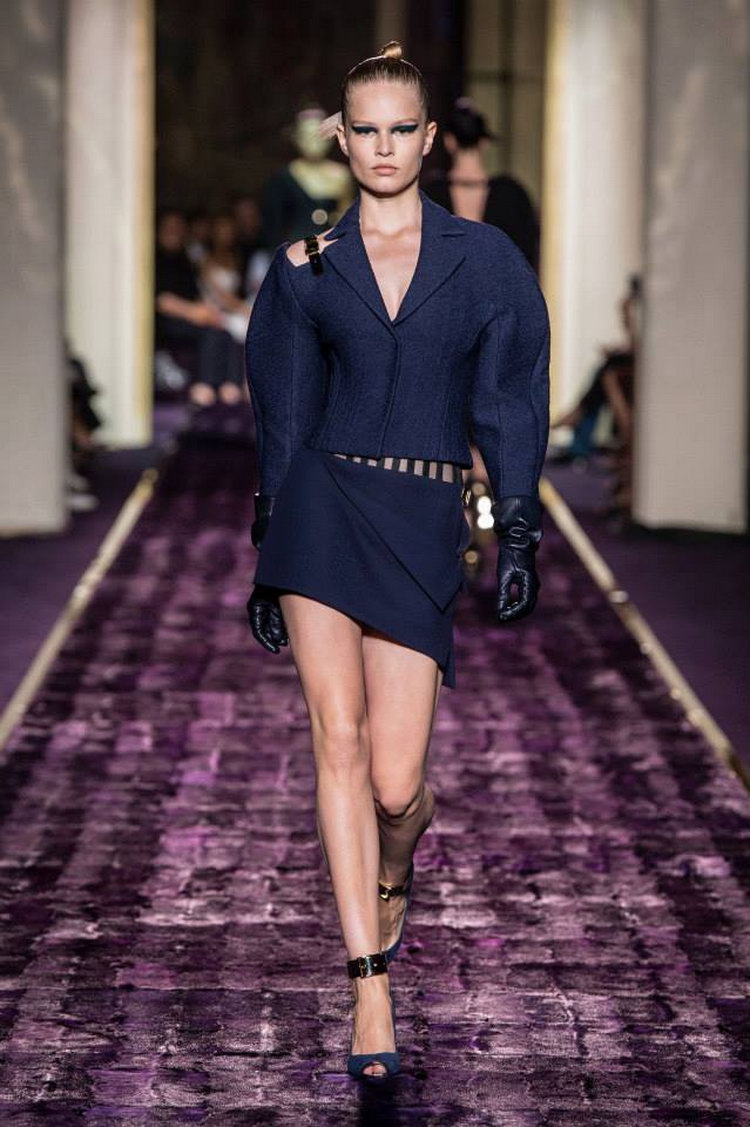 Atelier Versace with fresh allure is at the heart of Haute Couture.Long slashed-front dresses have one leg covered as if a trouser for contemporary attitude. Tailoring is cut away. Thin strips of vinyl embroidered onto a transparent base create graphic shapes. Opulent blue fur coats include frayed organza patchwork of mink with crystal metal mesh, exclusively created by Swarovski for this collection. – from Versace