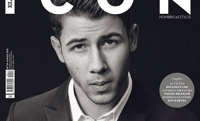 Icon Magazine enlists American musician Nick Jonas for their March 2015 cover story captured by fashion and celebrity photographer Michael Schwartz at De Facto Inc. In charge of styling was Angela Esteban Libero with grooming by Marissa Machado.