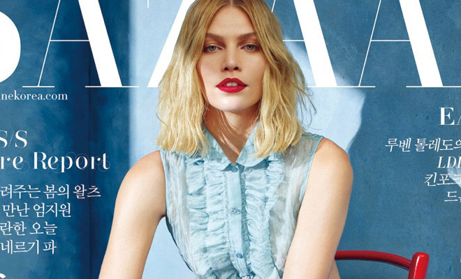 Supermodel Aline Weber takes the cover story of Harper’s Bazaar Korea‘s April 2015 edition shot by photographer Choi Yong Bin with styling from Mirim Lee. Makeup is courtesy of Yumi Lee with hair styling by Rolando Beauchamp.