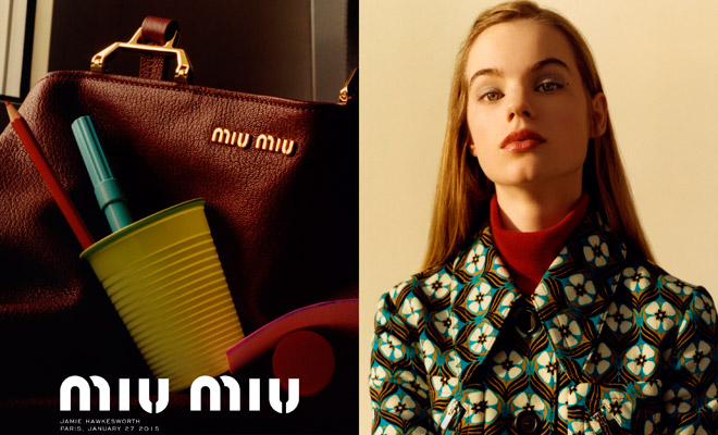 Miu Miu enlists the rising star on the modeling scene Estella Boersma for their Pre-Fall 2015 advertising campaign lensed by fashion photographer Jamie Hawkesworth with casting direction from Ashley Brokaw.