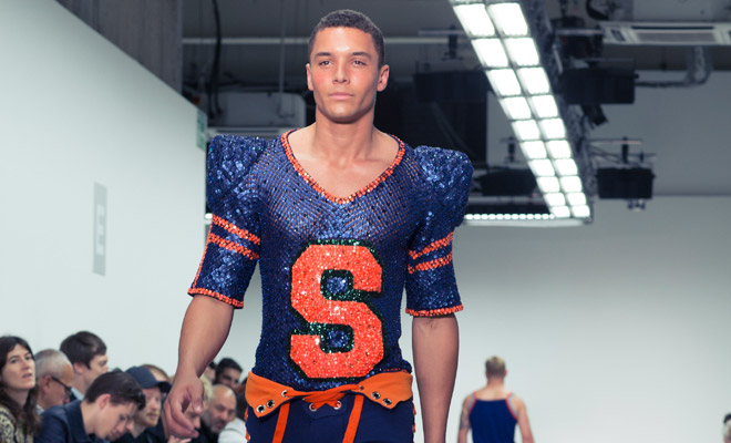The British trio Sibling presented their Spring Summer 2016 collection on day 2 of this year’s London Collections Men. Sibling stayed true to their tradition presenting playful designs, including tailored suits as well as looks inspired by American college football & cheerleaders’ costumes.