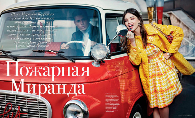 Australian supermodel Miranda Kerr stars in the cover story of Tatler Russia‘s October 2015 edition captured by fashion photographer Danil Golovkin with styling from Masha Fedorova. Hair styling by Svetlana Alpatova, with makeup by Natalia Vlasova.