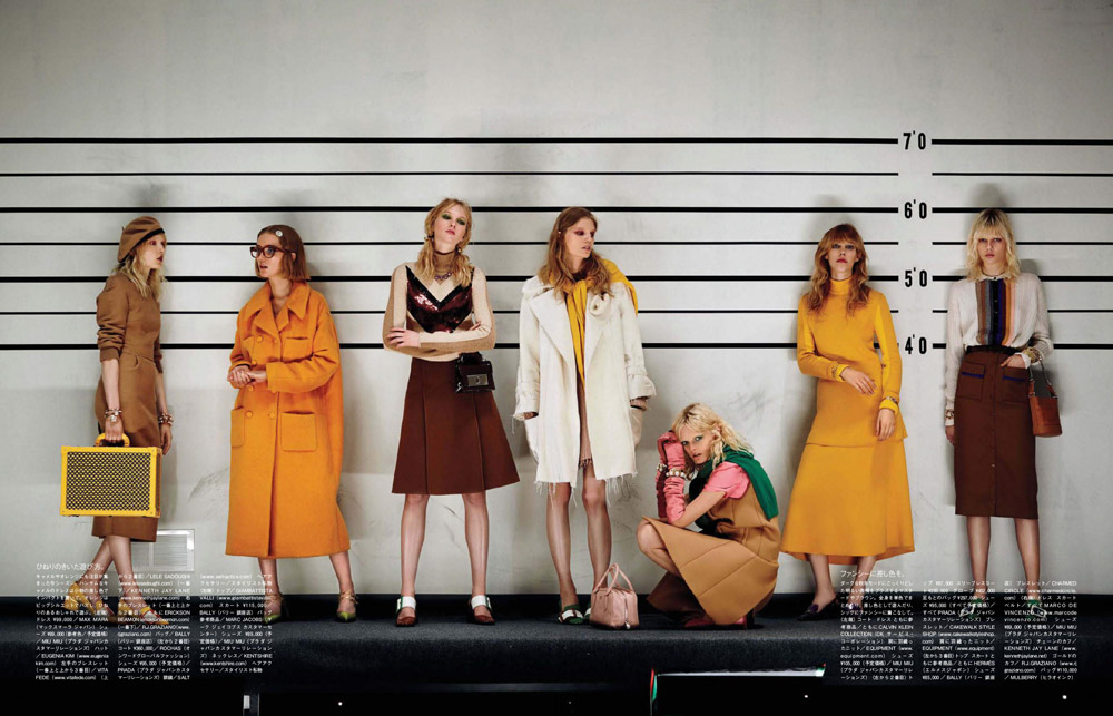 Fashion photographer Roe Ethridge teams up with stylist Giovanna Battaglia for Fashion Line Up story coming from the pages of Vogue Japan‘s December 2015 edition. Stars of the session are Anya Lyagoshina, Kris Gottschalk, Anne Verhallen, Ysaunny Brito, Astrid Holler, Heather Kemesky, Rose Smith, Satah Brannon, Mae Lapres, Mina Cvetkovic, Maja Salomon, Lou Schoof, Nastya Sten, Saara Sihvonen, Hanne Gaby Odiele, Eilika Meckbach, Marjan Jonkman, Kate King, Leila Ndabirade, Sabina Lobova, Georgina Hilmer, Antonina Petkovic, and Tilda Lindstam. Hair styling is work Franco Gobbi, with makeup by Frank B.