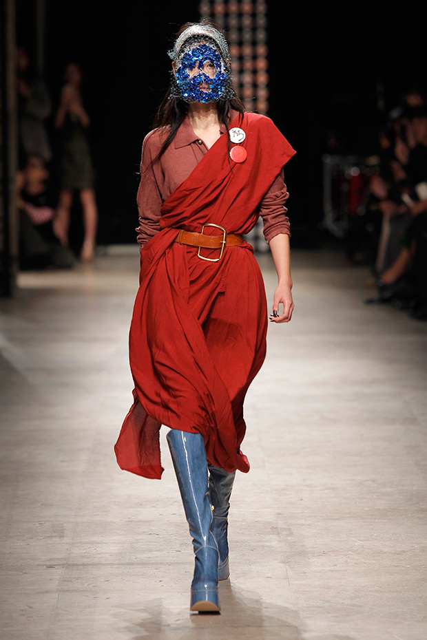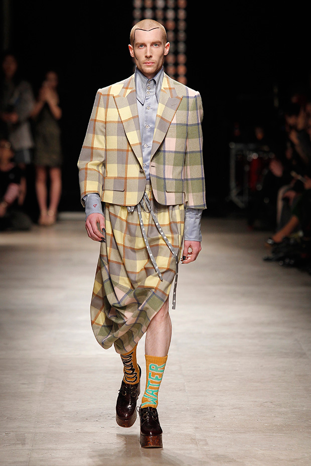 Andreas Kronthaler presented his Fall Winter 2016 womenswear collection called Sexercize for Vivienne Westwood during the recent Paris Fashion Week. The collection is a mixture of the punk influences and Buddhist monk uniforms. Kronthaler tried to blur gender codes. The show featured male models wearing platform heels and skirts and female models wearing masculine cuts, with an idea that man and woman should change their clothes.