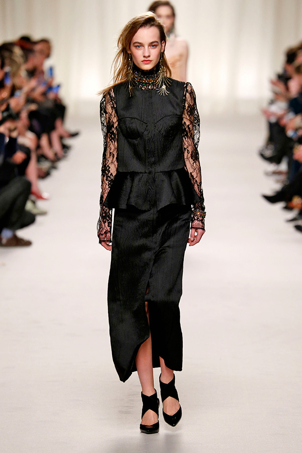 Lanvin presented Fall Winter 2016 womenswear collection during the recent Paris Fashion Week. The collection features eighties inspired suits, asymmetrical tops, lace blouses and satin dresses. The color palette includes peach, seafoam green, mauve, black and metallics.