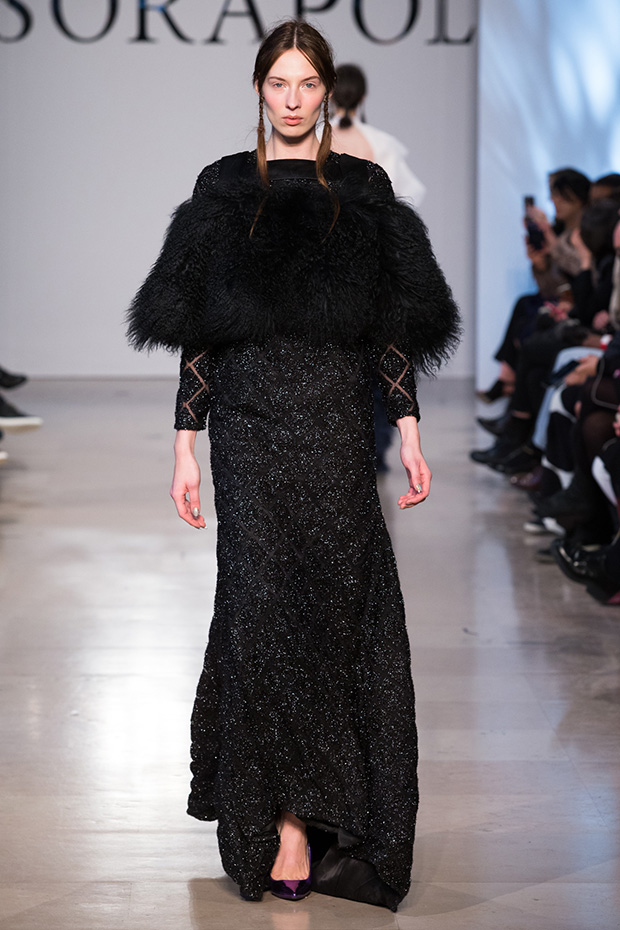 The magical colour of the Northern Lights streaking across the night sky, an electrifying rainbow of jewel-like tones instantly brightening a winter wonderland. Enchanting people across the world for centuries, the colours are striking, the movement is fluid, almost dance-like and the mood is other-worldly. Many cultures have their own stories about what the Aurora Borealis (Northern Lights) mean to them. Inuit folklore tells of the aurora representing the dance of the animal spirits they had once hunted. It was the beliefs, creatures and spirits of the Inuits and the colours and motion of the lights themselves that inspired the autumn/winter 2016 Sky-Dweller collection for SORAPOL. Showing for the very first time at Paris Fashion Week, the London-based fashion brand is the brainchild of Head Designer & Director, Sorapol Chawaphatnakul and Creative Director, Daniel Lismore. After several successful seasons showing ready-towear collections in London, this season, the brand has pioneered its creative and technical excellence to make a much-anticipated move into the art of demi-couture. The collection is a vision of beautifully-crafted pieces, covering demi-couture and eveningwear. The defining silhouette is an elegant fishtail gown, while sleek bodycon shapes and contrasting oversized skirts complete with artful draping offer diversity. Laser cutting techniques are used and with lots of sheer details and sequin embellishment, texture is rich and luxurious. Capes as well as tasselled and signature boxy jackets are the collection’s outerwear offering, with particular fanfare for a cape crafted from Italian wool and decorated with ostrich feathers. The fabrics used are beautiful and of the highest quality; from jacquard to tweed and diamond lurex net as well as a cotton-based fabric with a long pile creating a Dalmatian effect, ostrich and marabou feathers and SORAPOL’s very own devore. Much like the Northern Lights themselves, the collection sees colour, spirit, movement and intricate detail with every look. – from Sorapol