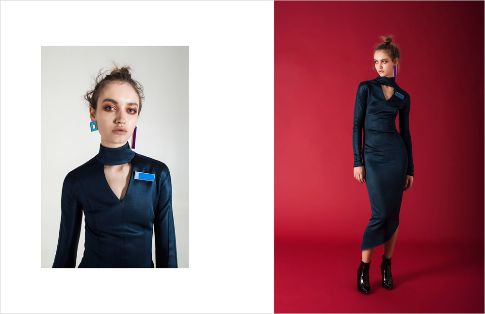 Sylvio Giardina’s new project SEVEN [7] was inspired by “tangram”, the ancient Chinese puzzle that dissects square into seven geometric shapes “Pulling apart to recreate“. The Fall Winter 2016.17 Collection was based on the definition of geometric shapes breaking from strict rules in order to build dynamic geometries and ever-changing volumes, with irregular cuts that outline essential lines, and in colors such as black, blue, bronze, warm gray, and petrol blue. For the collection Sylvio used fabrics such as velvet, jersey, brocade, velvet lace, and satin.