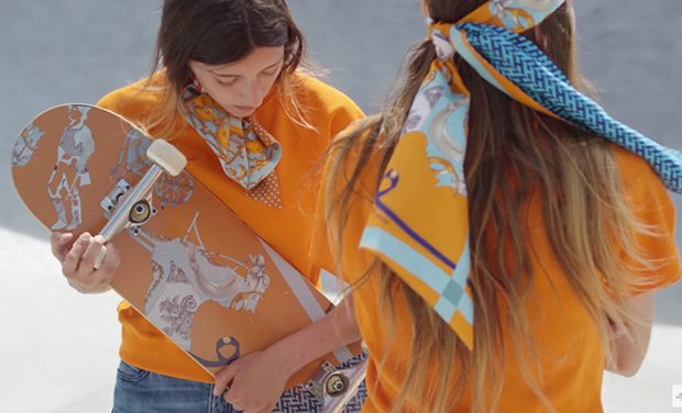 Hermèspresented its latest collection of Maxi-twilly cut scarves in this new skate video. The collection made from 100% silk, features 15 elegant scarves decorated with typical Hermès’ designs.