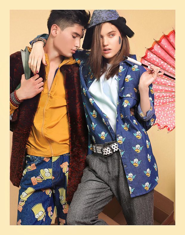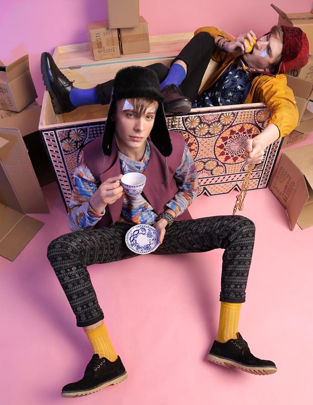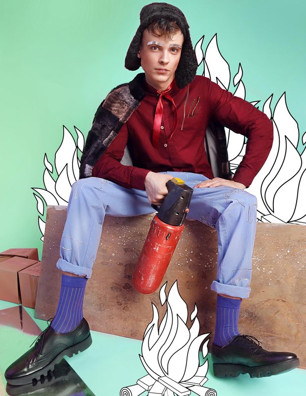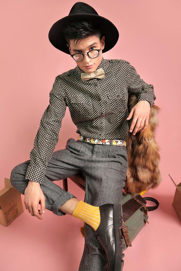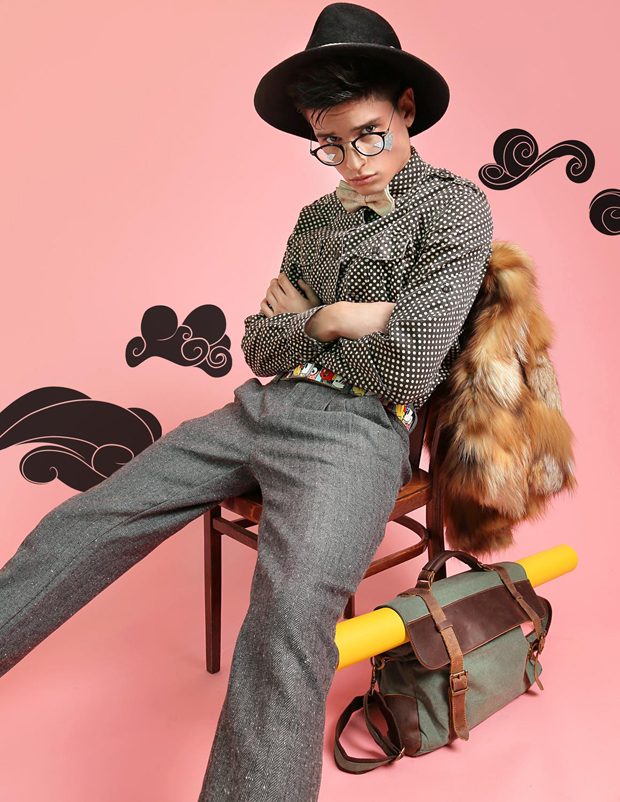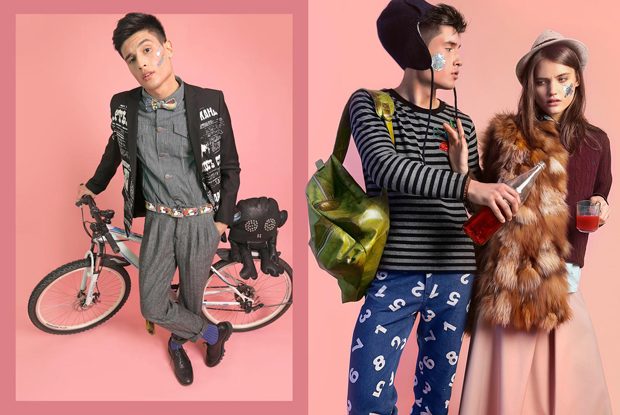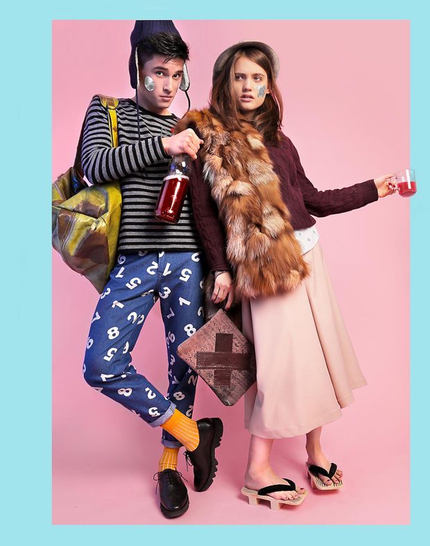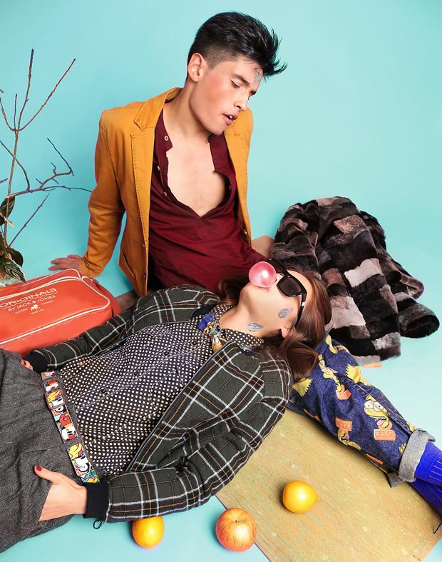 Fashion photographer Saidazim Fazilov teams up with stylist Aziz Saidmahmudov for an exclusive DESIGN SCENE STYLE story Funk n Asia featuring models Malika Askarova at F Fashion Milan, Laziz Rustamov, Artur Zlatovlasiy and Dima Romanov, all represented by NNModels. Hair and makeup are done by beauty artist Xenia Altman. (image: jacket, glasses, bow and belt ZERLUMP, trousers and sweatshirt KANISHKA, coat and shoes NIKOLAY NAM, strap ZERLUMP)