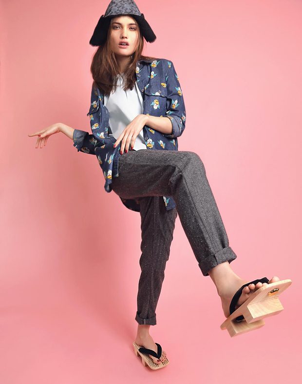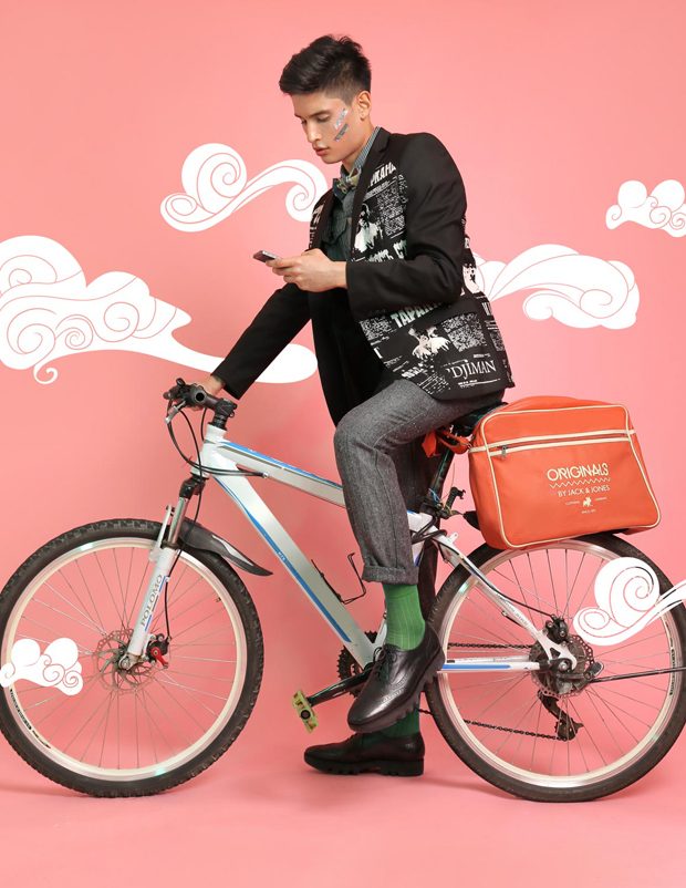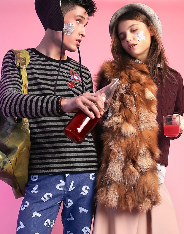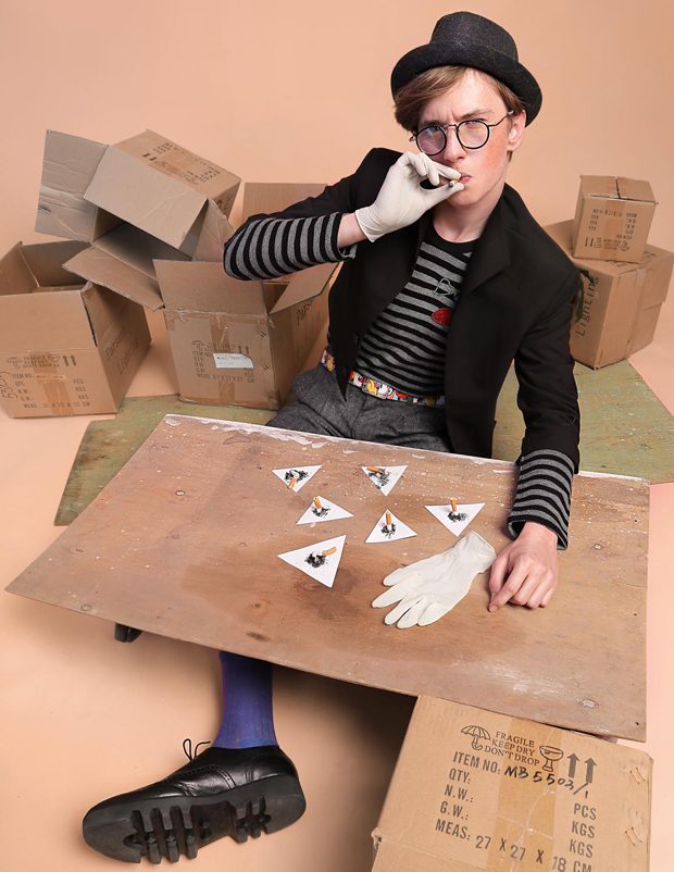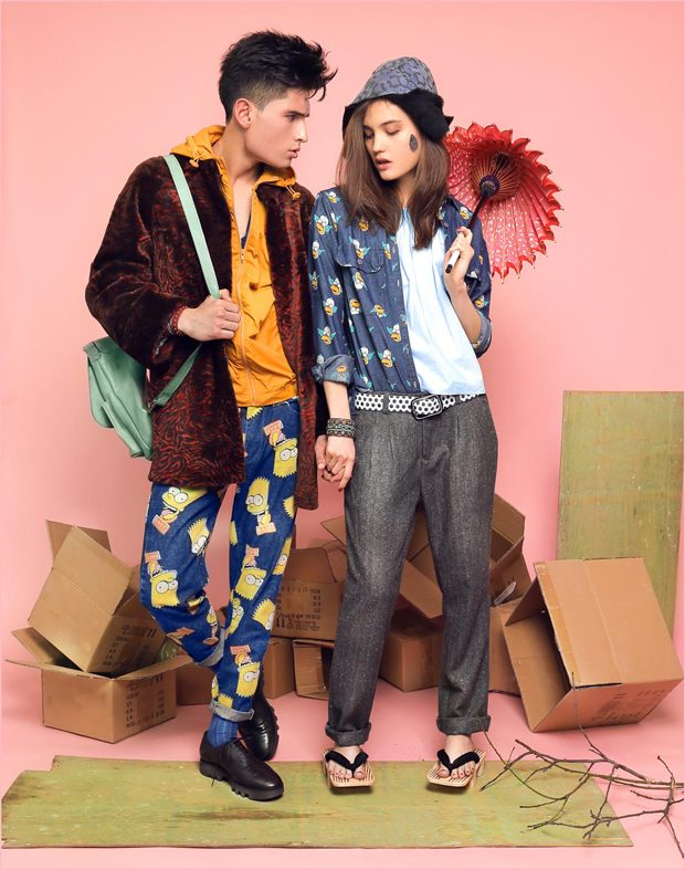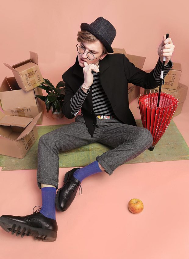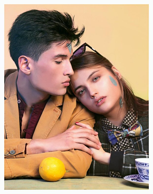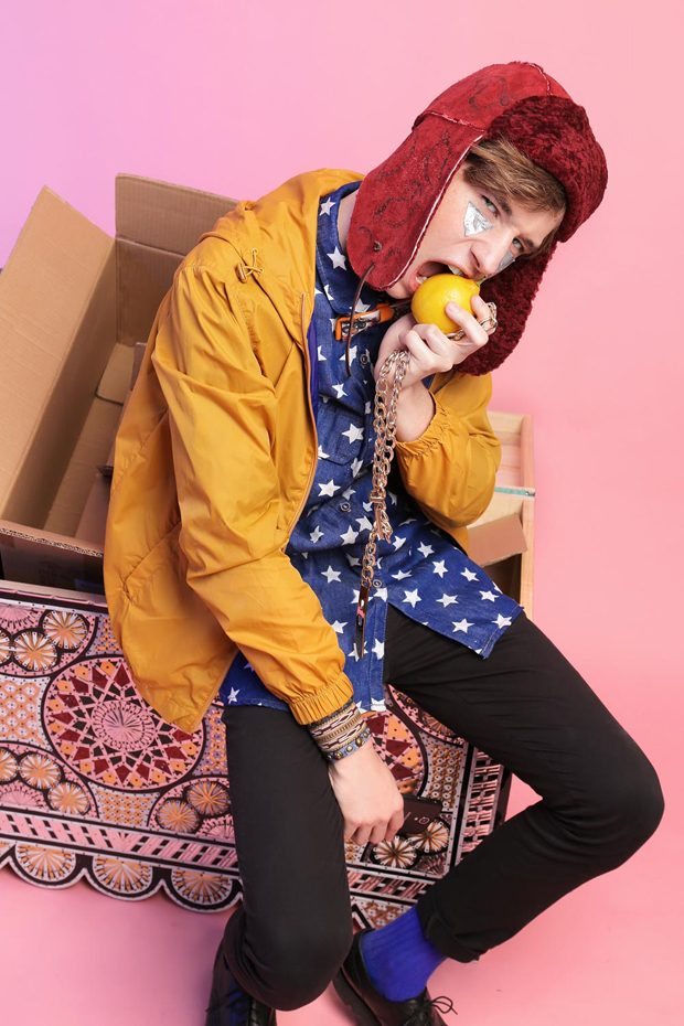 Fashion photographer Saidazim Fazilov teams up with stylist Aziz Saidmahmudov for an exclusive DESIGN SCENE STYLE story Funk n Asia featuring models Malika Askarova at F Fashion Milan, Laziz Rustamov, Artur Zlatovlasiy and Dima Romanov, all represented by NNModels. Hair and makeup are done by beauty artist Xenia Altman. (image: jacket, glasses, bow and belt ZERLUMP, trousers and sweatshirt KANISHKA, coat and shoes NIKOLAY NAM, strap ZERLUMP)