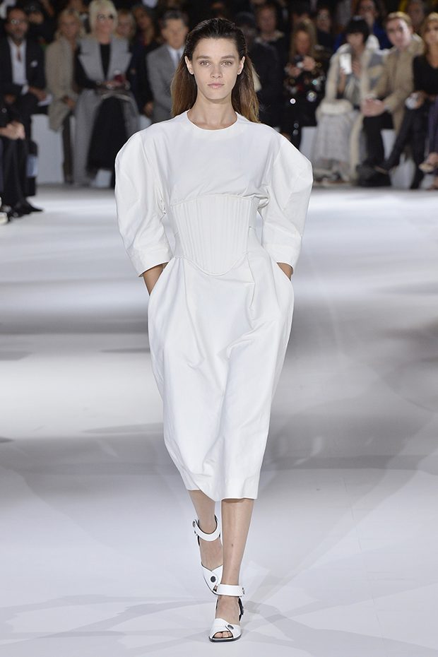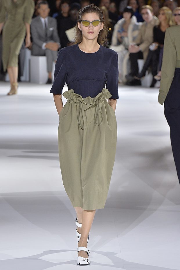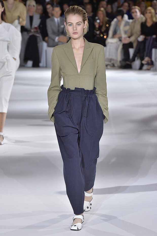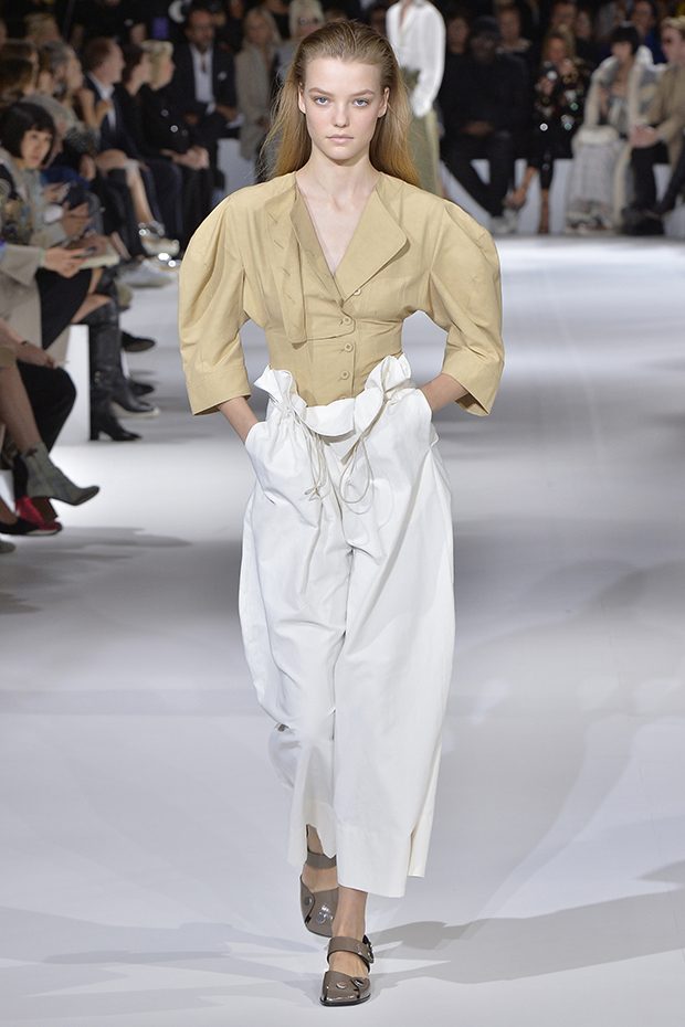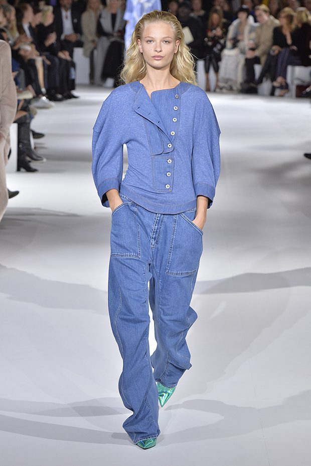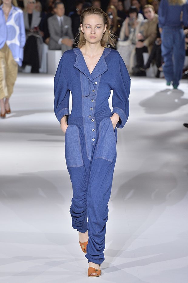 Capturing the spirit of life and love with the ease of summer. Signature textures in shapes that clash and complement each other create softness and serenity in movement. Corsetry inlayed into pure cotton shapes. Tailored shoulders and billowing sleeves are captured by ruched trousers and skirts. Eco-friendly smooth ultra-suede in a signature all-in-one and trousers echo the feeling of freedom in tan colours, while keeping the brand’s innovative cruelty free philosophy. Organic wovens in washed cotton muslin come in natural shades of cedar and khaki to form rich volumes on asymmetric dresses and bag trousers, which are gathered and drawn in, or belted with fold up utility bags. Knitwear in textured linen stitches, silk mix slub yarns and light gauzes, with large sacks in organic jute An edgy feminine take on menswear; classic English men’s shirts are darted into gentle, sophisticated shapes to give a polished appeal with overprinting and immaculate pattern cutting in pure white and sky blue. Denim is polished in fine knits that merge seamlessly in all-in-ones. True blue separates are layered with a frayed cape-like detail. – from Stella McCartney