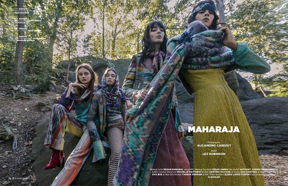 Fashion photographer Alejandro Cabezut teams up with stylist Lex Robinson for Maharaja story coming from the pages of our Design SCENE Magazine‘s January / February 2017 edition. Stars of the session are models Ana Cristina, Cristina Piccone, Eva Bus, and Tarsha Orsman. In charge of beauty were makeup artist Regan Rabanal, assisted by Cesar Abreu, using MAC, hair stylist Anthony Joseph Hernandez at Artmix Creative, and manicurist Michelle Matthews.