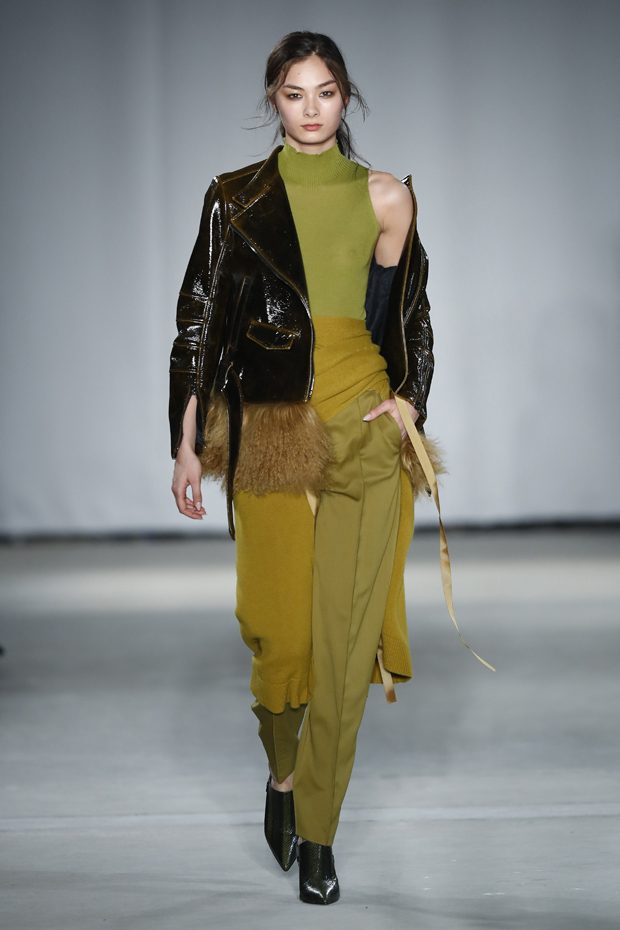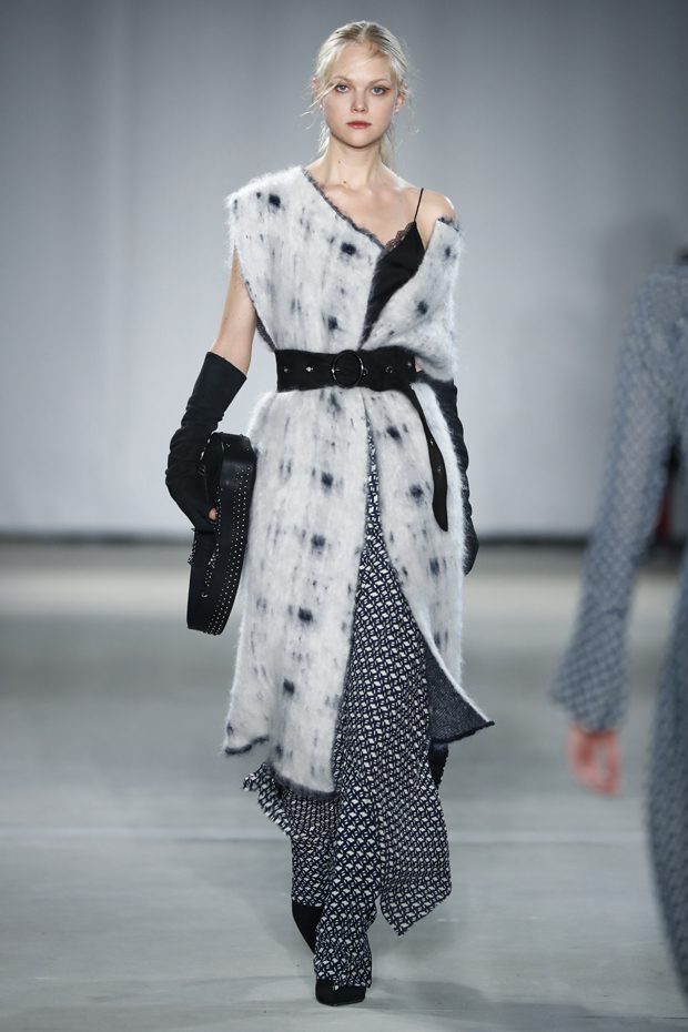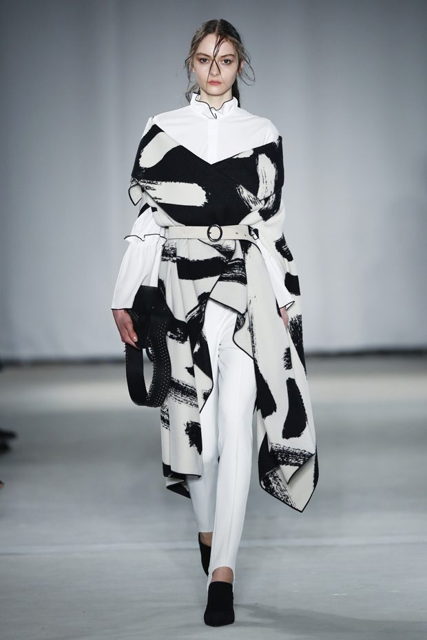 Moreover the textures and prints of this collection deserve devotion, they are incredibly artistic and seem to be hand- painted. Accompanying, the colour- palette consists of a play with contrary elements: diamond black, sheer white plus subtle mint are paired with deep blue and soft shades of yellow, for instance saffron. Fabric- wise, jacquard and lacque is used in different variations. Albeit also wool, leather and merino fur are deployed. That underlines the very wearable, comfortable character of those outfits.