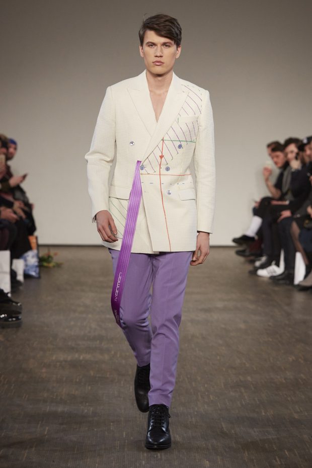 Worth of mentioning is the very special detail- awareness of this collection: colourful lines visualize processing instructions are leading to the final design. Our favourite piece is a sweater that is kept in violet hues on its one half, and provided with a specific alignment on the other side. That piece is unique but still stays very wearable. Likewise, that specific alignment can be recognized on various of the collections’ jackets and trousers. The final products are presented as the result of the creative process.