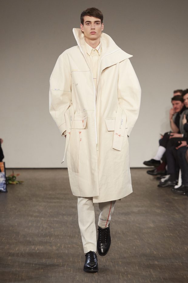 Sundry of the collections’ looks are kept bicolored, whereas other looks are kept tonal. For example a sheer white oversized- coat is paired with a sheer white trousers. Both pieces are provided with special allignment, of course.