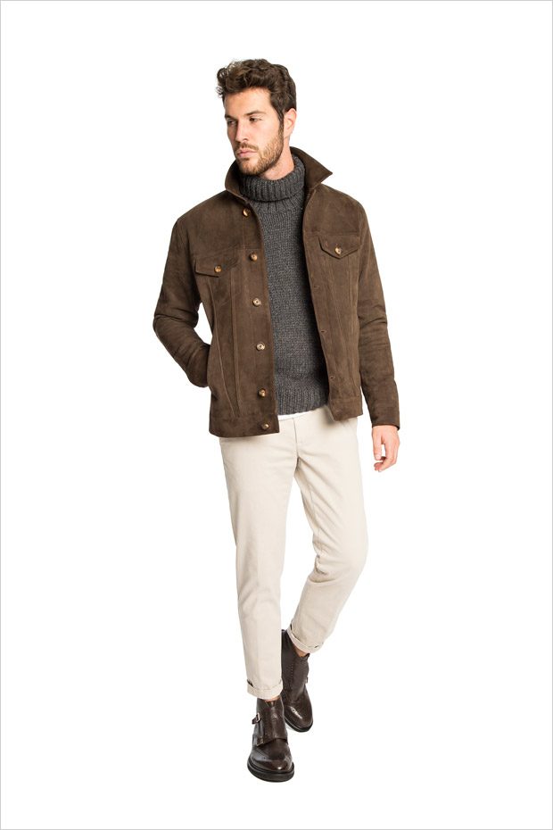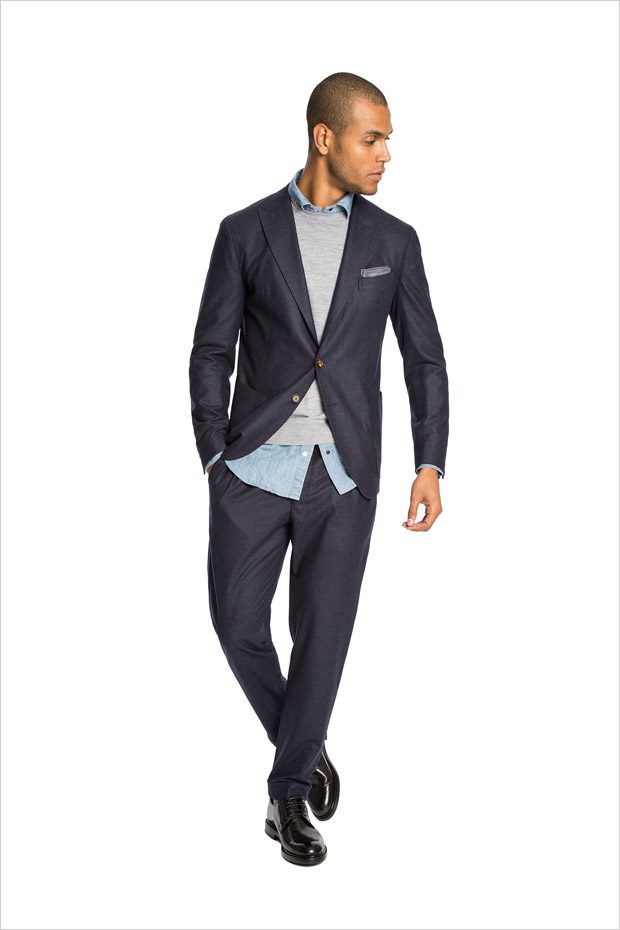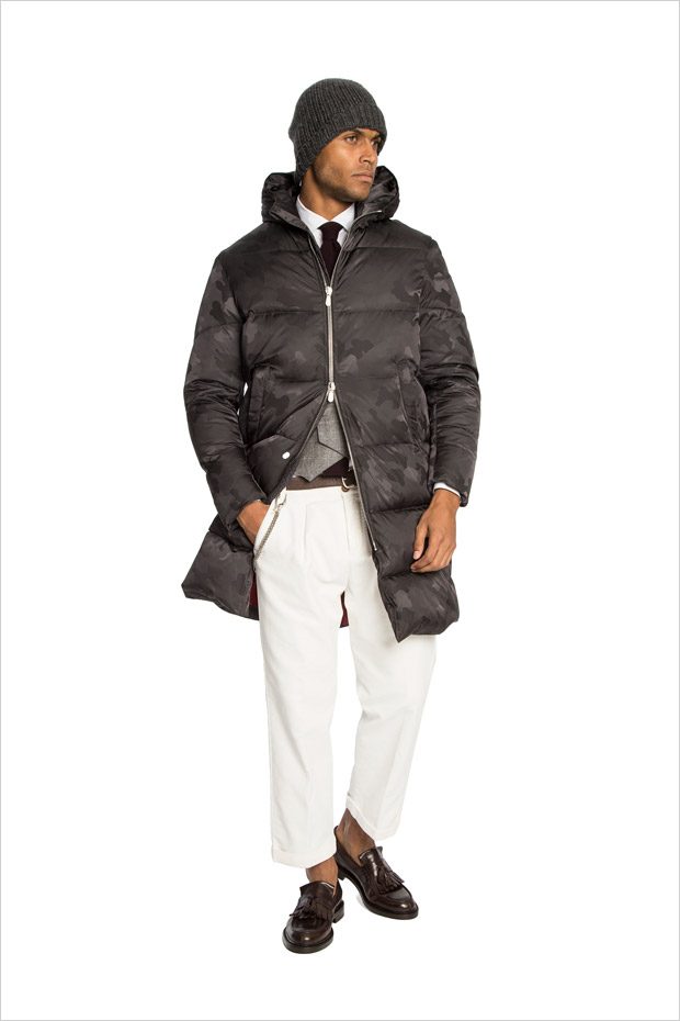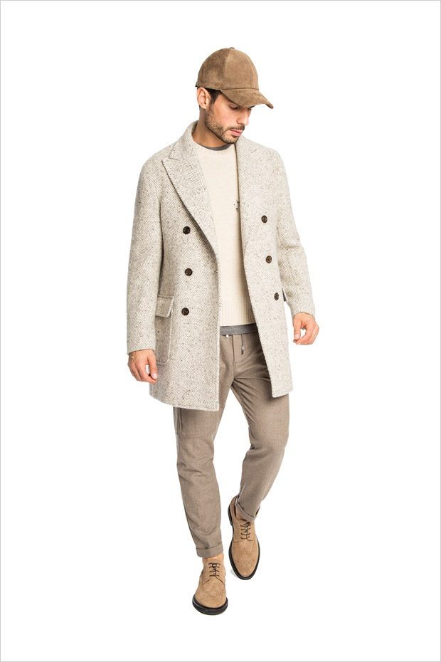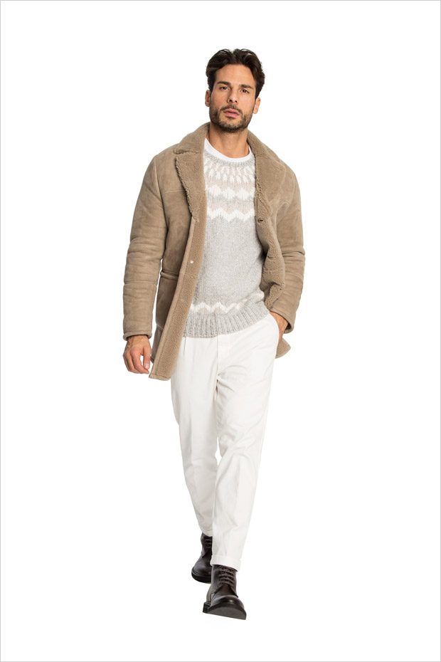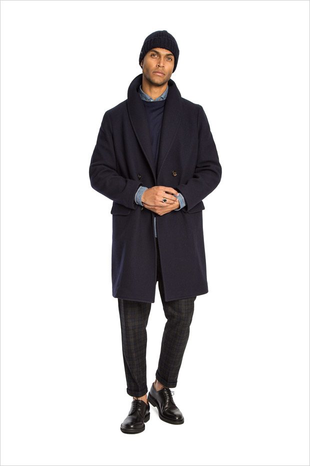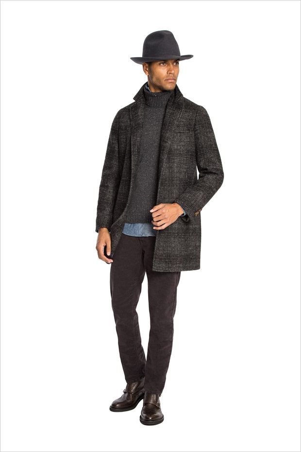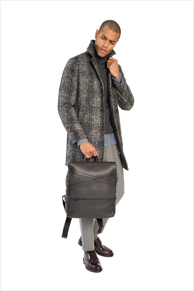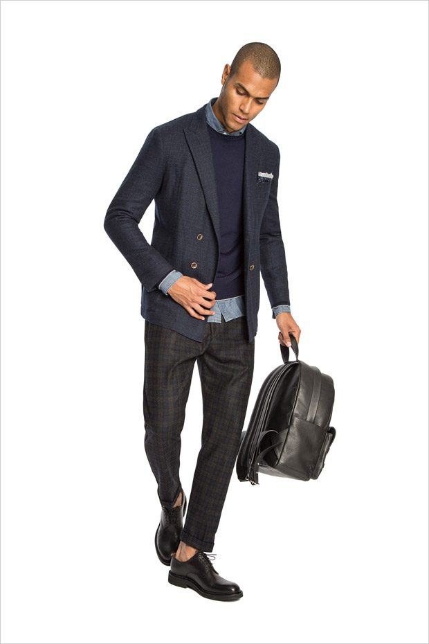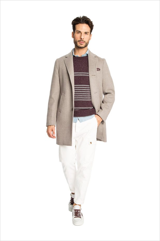 “The Eleventy Fall-Winter 2017 collection is designed to meet the needs of contemporary cosmopolitan man. The themes of the collection come from the different moments of his life. Eleventy redefines traditional dressing by using a combination of genres, introducing the new Casual Office style for the executive. It is in this area we see the tie has fallen away in favor of knits to be worn with soft jackets and cotton pants paired with untucked shirts in denim and subtle prints. The coats have been reworked to be longer and softer. Fashioned in boiled wools and cashmeres, often forgoing the traditional lapel for a shawl.” – Eleventy