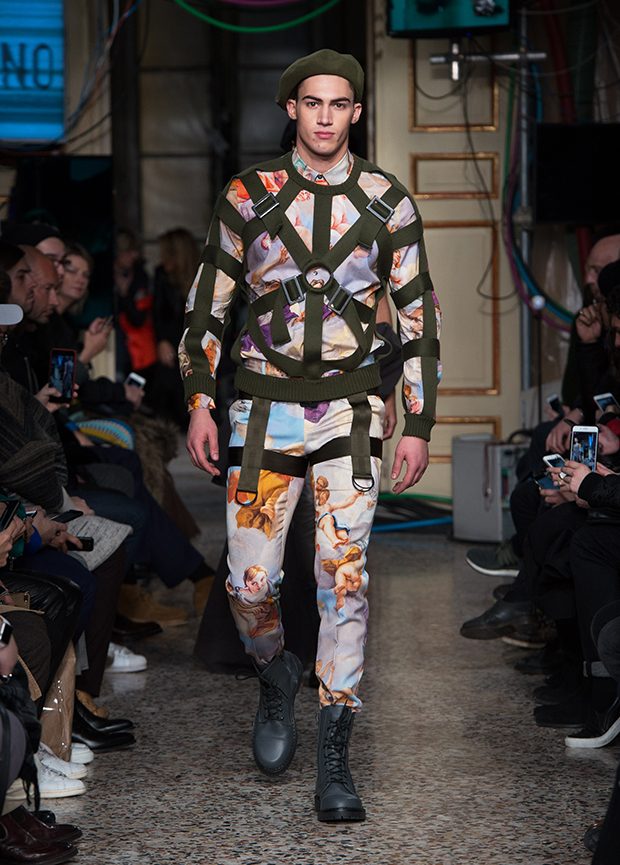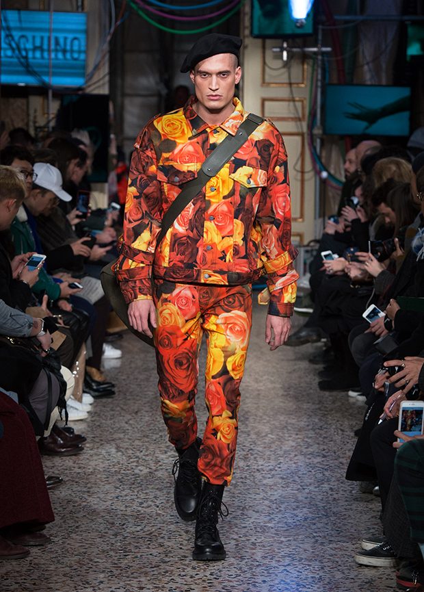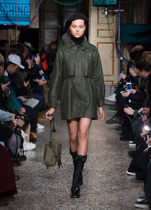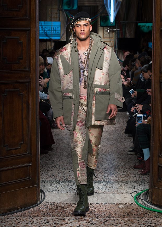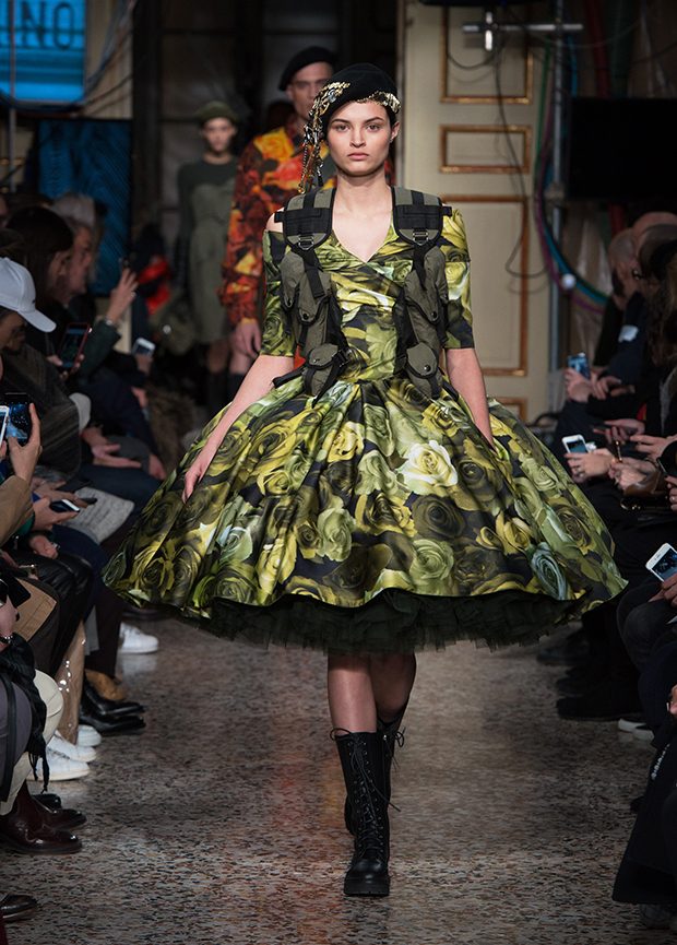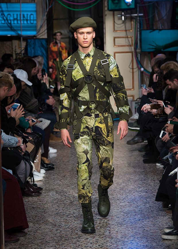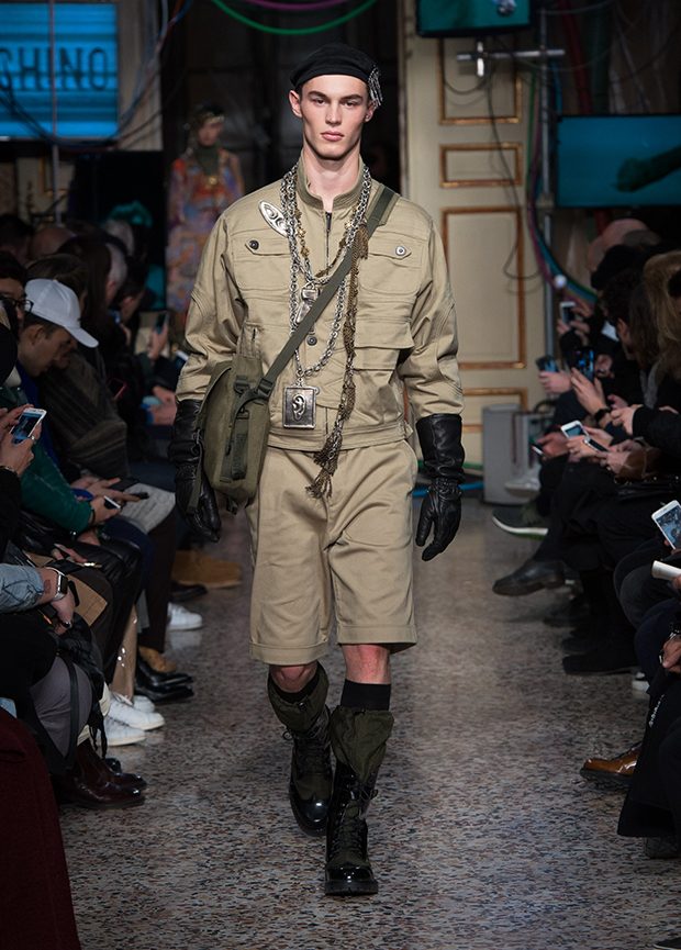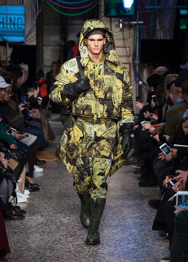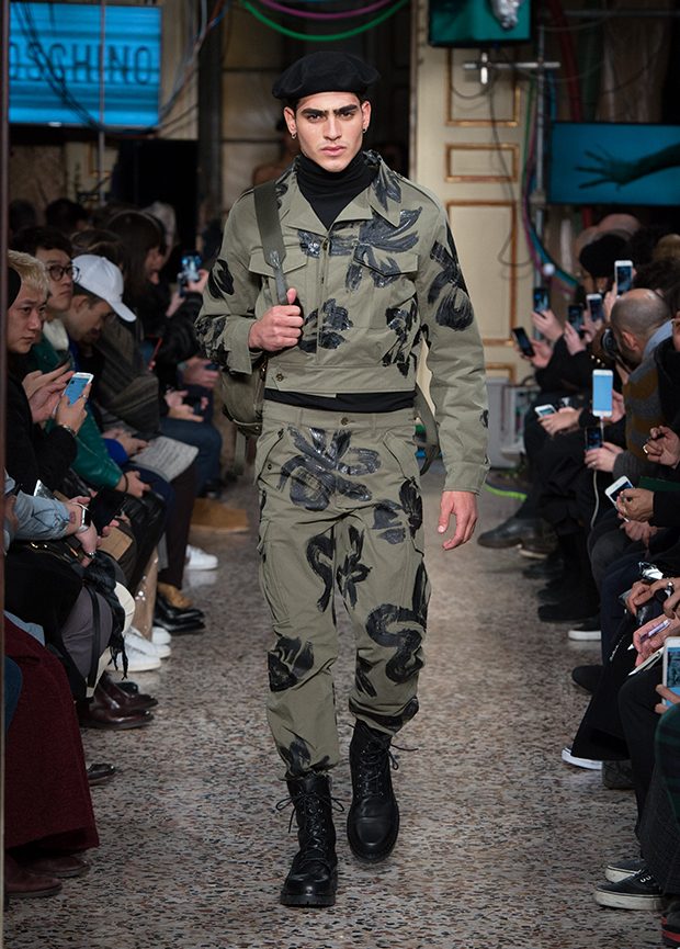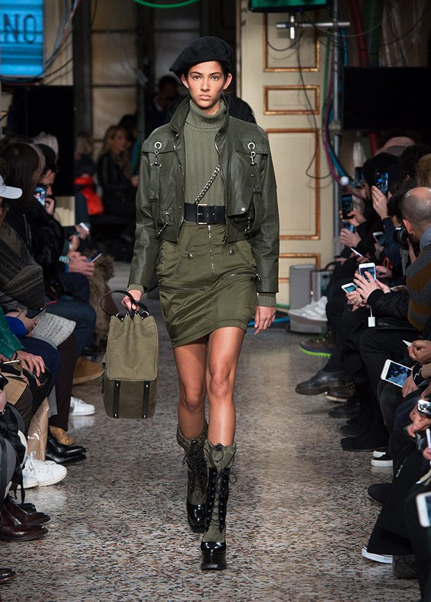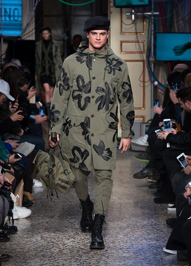 The place: an ancient palazzo. The time: an indeterminate future. The collection: a curated clash between dystopia and hope presented by Moschino designer Jeremy Scott. For Pre-Fall and Menswear Fall/Winter 2017 we are on a mission. The models emerge into the scarlet glow of digital clocks set to countdown. The collection is half artful collision, half meaningful division. The baseline uniform is military. Olive cotton drill and parachute silk are issued as jumpsuits, elongated MA1’s, field jacket skirts, and camouflaged combat separates. These are worn alongside webbing harnesses, combat boots and cavalry boots. Ripcords provide ruche and gather, a hooded wind-cheater is deployed as a ruffled dress, and that camo’s color-scheme is twisted from you-don’t-see-me to oh-please-do: but this much more than a by-the-numbers subversion of military gear. – from Moschino