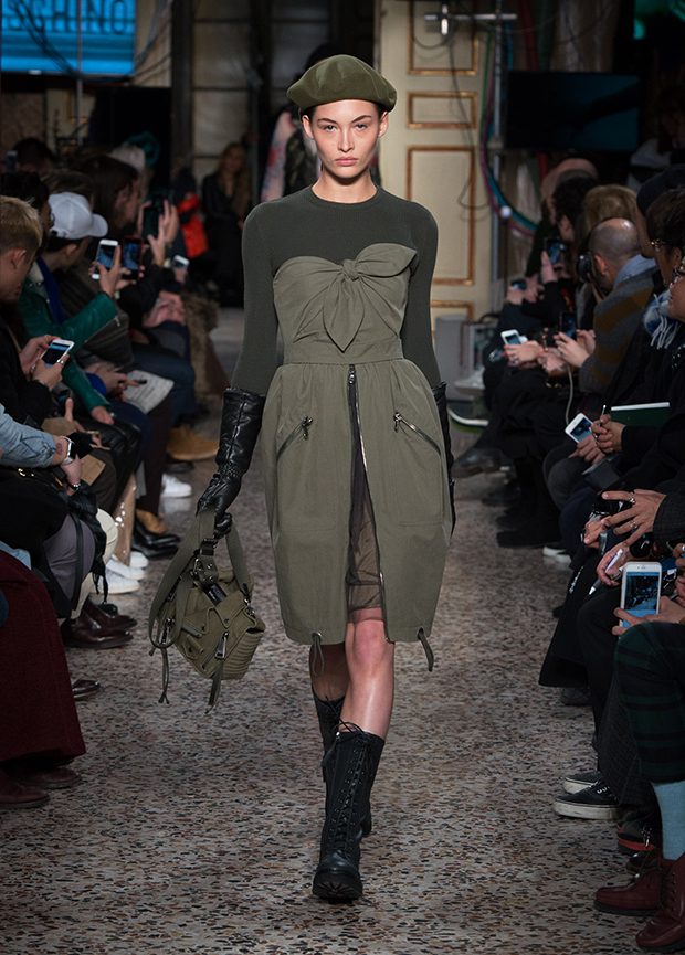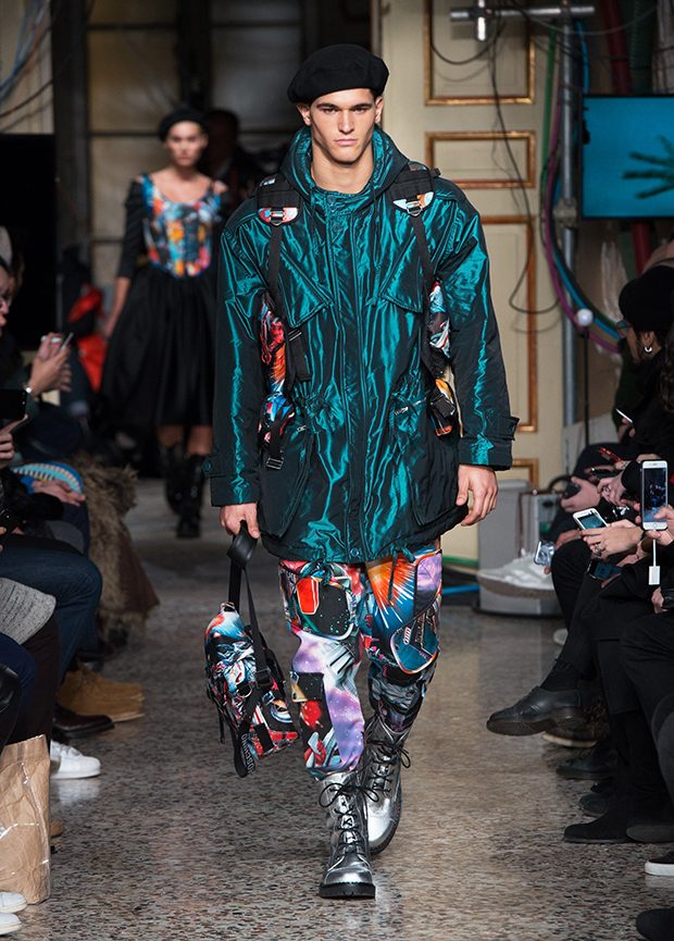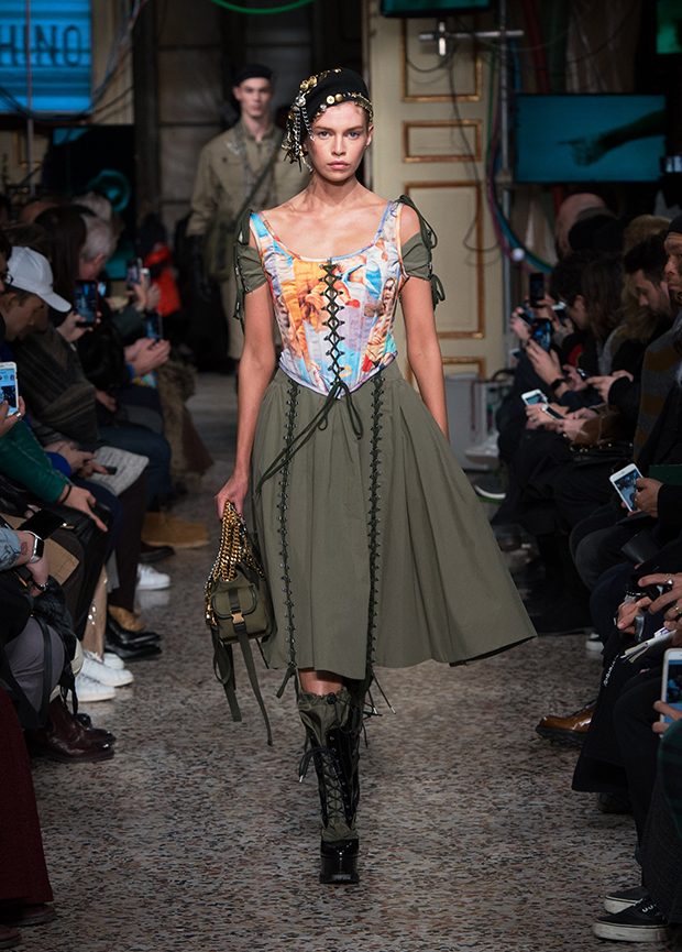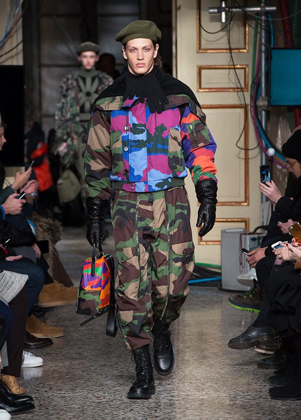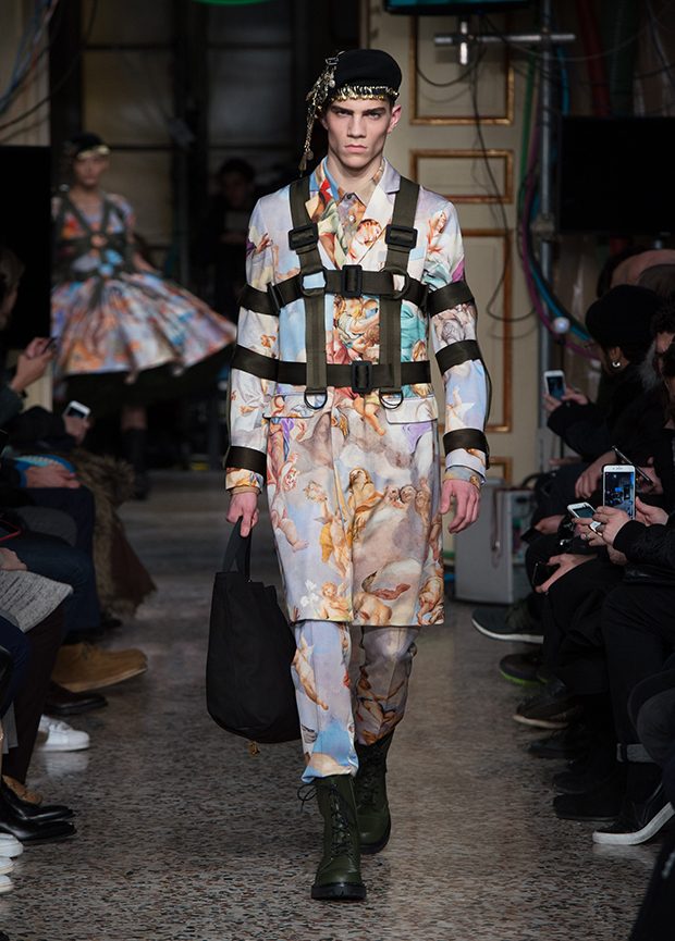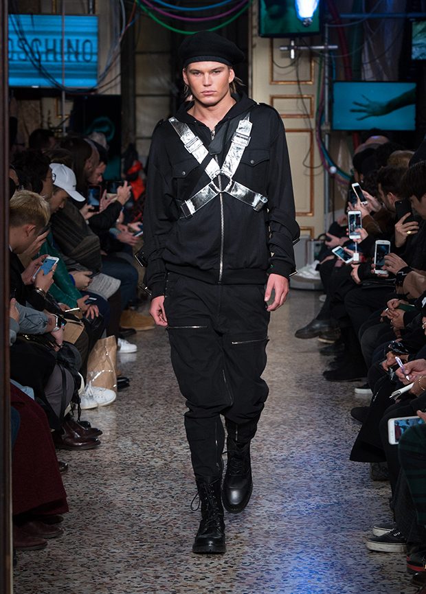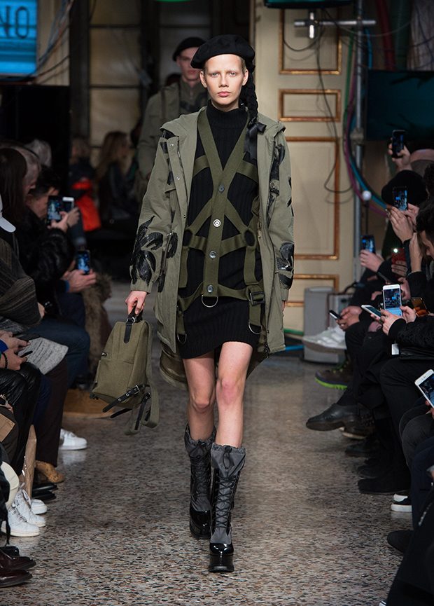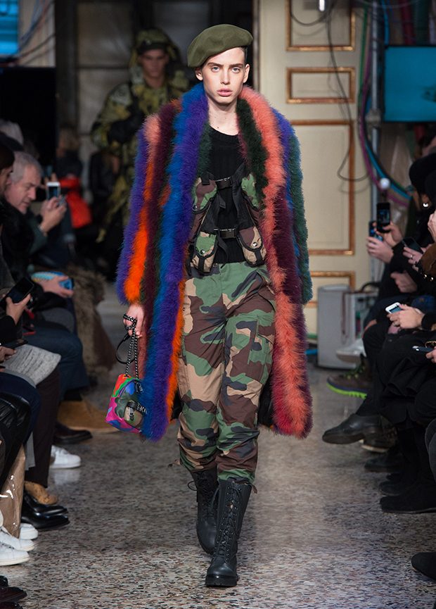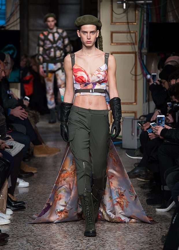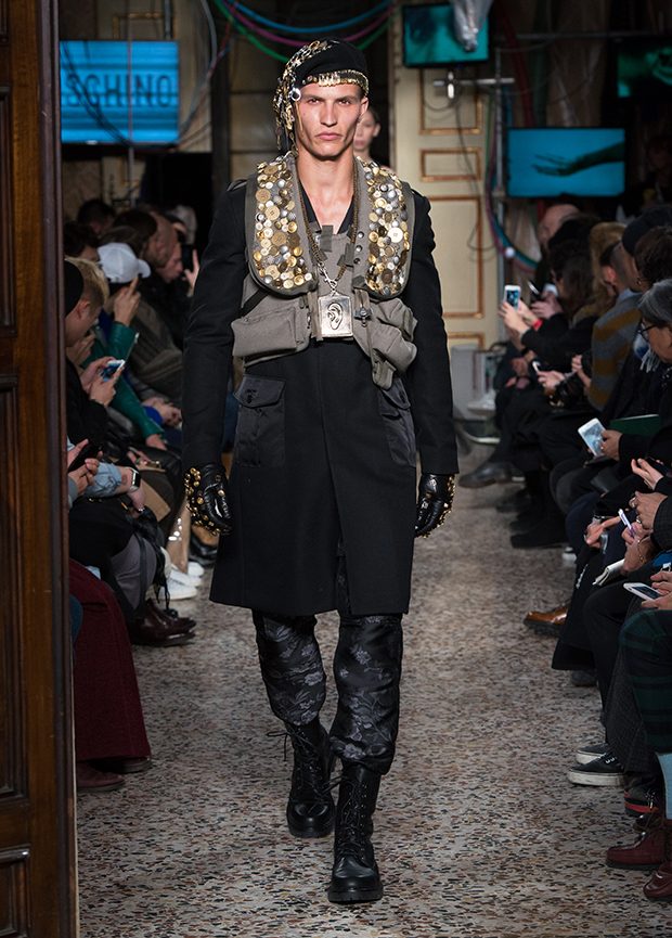 The place: an ancient palazzo. The time: an indeterminate future. The collection: a curated clash between dystopia and hope presented by Moschino designer Jeremy Scott. For Pre-Fall and Menswear Fall/Winter 2017 we are on a mission. The models emerge into the scarlet glow of digital clocks set to countdown. The collection is half artful collision, half meaningful division. The baseline uniform is military. Olive cotton drill and parachute silk are issued as jumpsuits, elongated MA1’s, field jacket skirts, and camouflaged combat separates. These are worn alongside webbing harnesses, combat boots and cavalry boots. Ripcords provide ruche and gather, a hooded wind-cheater is deployed as a ruffled dress, and that camo’s color-scheme is twisted from you-don’t-see-me to oh-please-do: but this much more than a by-the-numbers subversion of military gear. – from Moschino